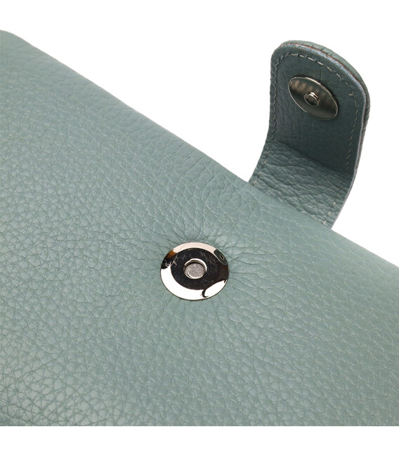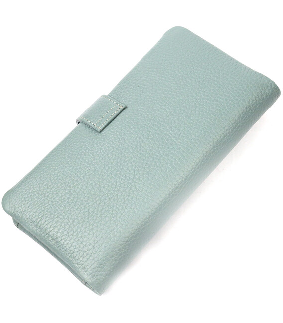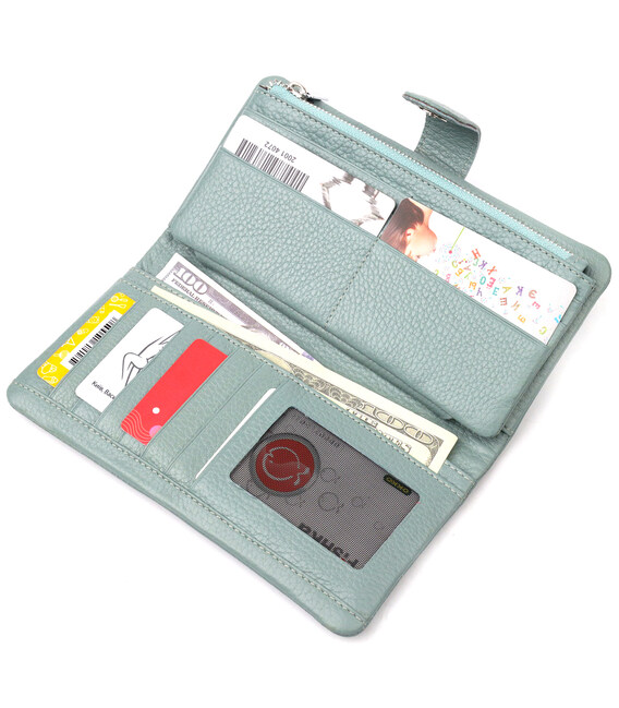 Превосходный женский кошелек из натуральной зернистой кожи, в красивом бирюзовом цвете. Внутренний разворот состоит из четырех открытых отделений для купюр, одного кармана с расширителем на застежке, одного скрытого кармана на молнии, одного кармана-перегородки на молнии, одного сетчатого карманчика и двенадцати секций для пластиковых карт. Складывается аксессуар пополам, с фиксацией на хлястик с магнитом. Такой кошелек из натуральной кожи - это идеальный вариант на каждый день для тех, кто ценит качество, удобство и комфорт.