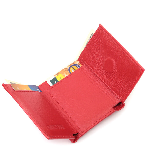 Яркий кошелек для женщин из натуральной качественной кожи. Модель имеет небольшие размеры закрывается на магнит. Снаружи можно увидеть отделение для монет. Дабы не утяжелять аксессуар, внутри расположен самый минимальный функционал: пару отделений для бумажных денег и две ячейки для пластиковых карт. Снаружи изделие прошито ровной строчкой по краю и украшено металлическим логотипом компании производителя, которое размещено на клапане посередине. Портмоне дополнено надежной фурнитурой и крепкой подкладкой. Упакован аксессуар в белую плотную картонную коробку с фирменным логотипом.
