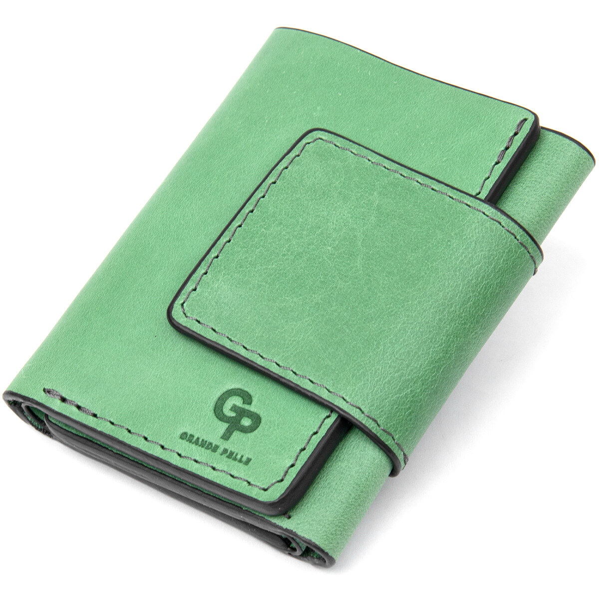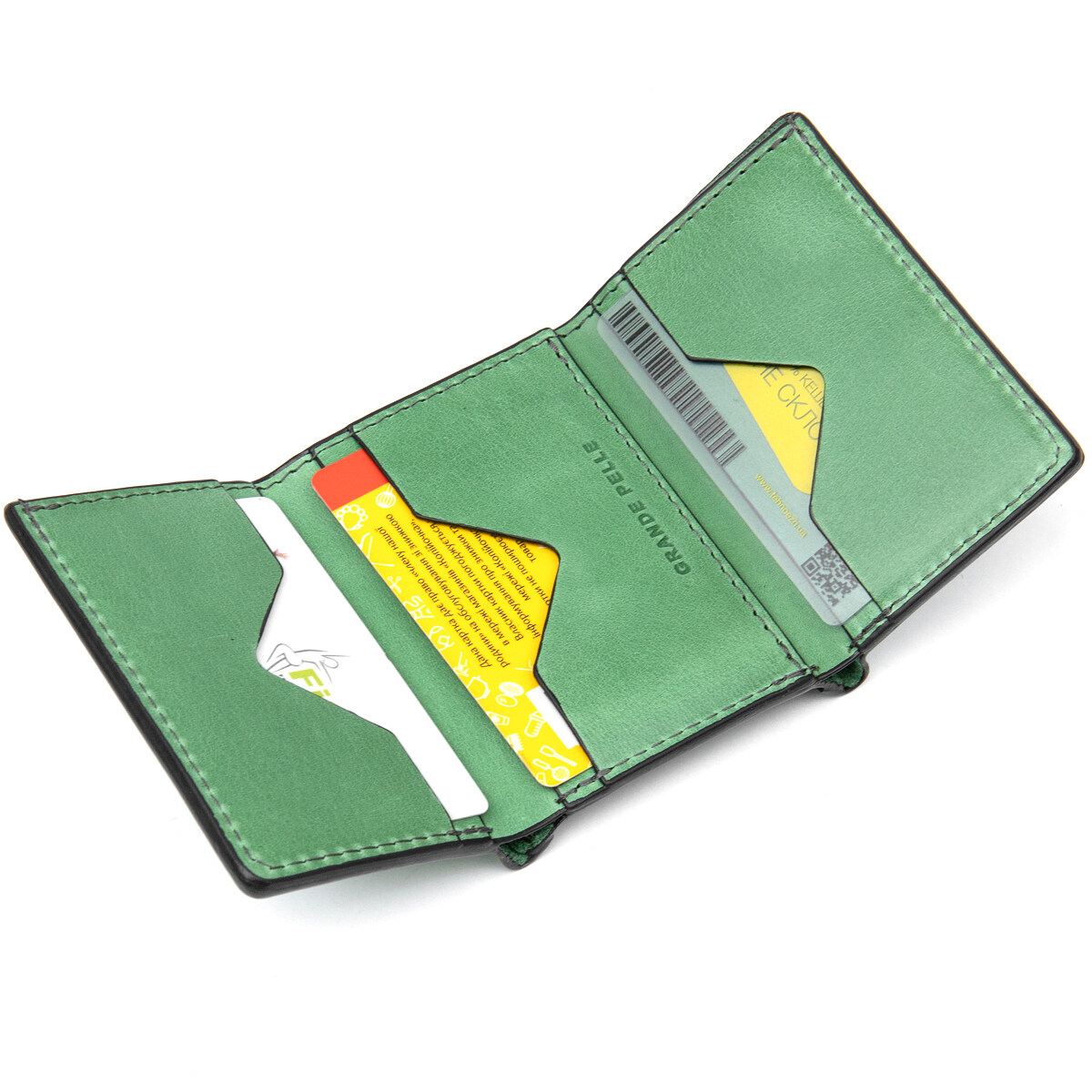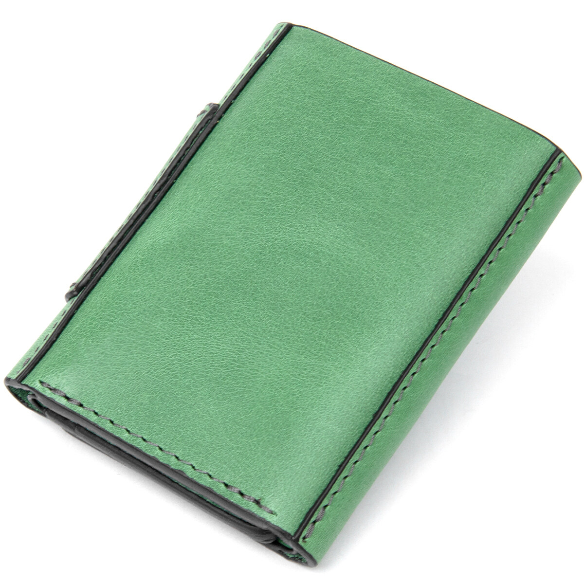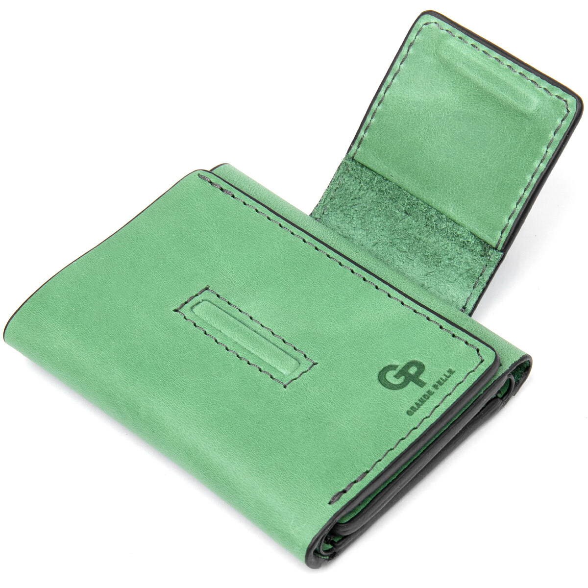 Очень красивое портмоне в необычном зеленом цвете с черной окантовкой краев. Выполнено из натуральной кожи высокого класса исполнения. Закрывается на удобный и практичный скрытый магнит. Внутри есть слоты для карточек и отделение для купюр. Упаковка представлена в виде фирменного чехла.