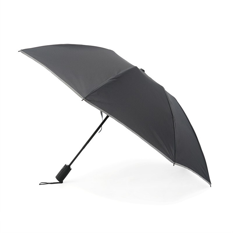 Складной зонт, полный автомат. Состав: 100% полиэстер, материал спиц: сталь, углепластик. Плотность ткани: 210T. Количество спиц 8. Имеет рефлективную полосу. Длина в сложенном виде: 31 см Диаметр купола: 105 см