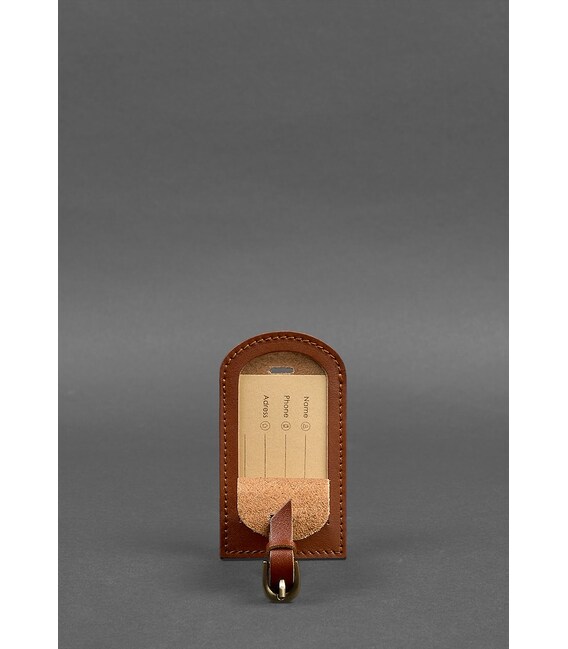 Виготовлена бірка повністю вручну з міцної натуральної шкіри краст в світло-коричневому кольорі. Усередині аксесуару є вкладиш для запису контактних даних власника багажу. Віконце з вкладишем закрито шкіряним хлястиком.