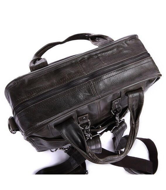 Вертикальна шкіряна сумка трансформер з натуральної шкіри темно-сірого кольору. Сумку можна носити в руці, через плече і за спиною як рюкзак. На лицевій стороні сумка має велике відділення кишені на блискавці, за яким ховається велика потайна кишеня на магнітній кнопці. На задній стороні сумка має величезну накладну кишеню на магнітній кнопці. Внутрішній відсік сумки закривається на блискавку. Всередині є кишеня на блискавці і дві накладні кишені для телефонів.