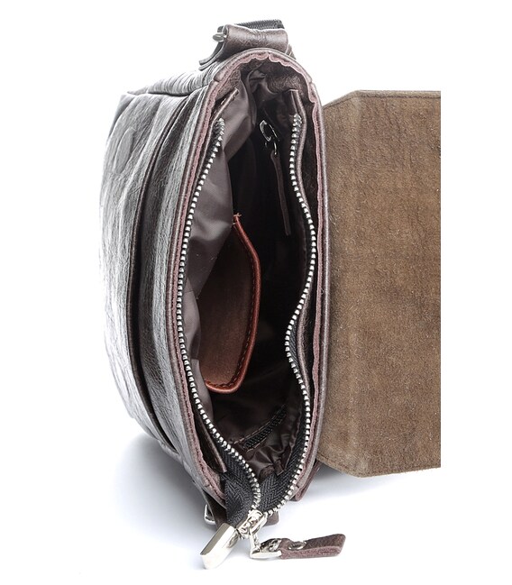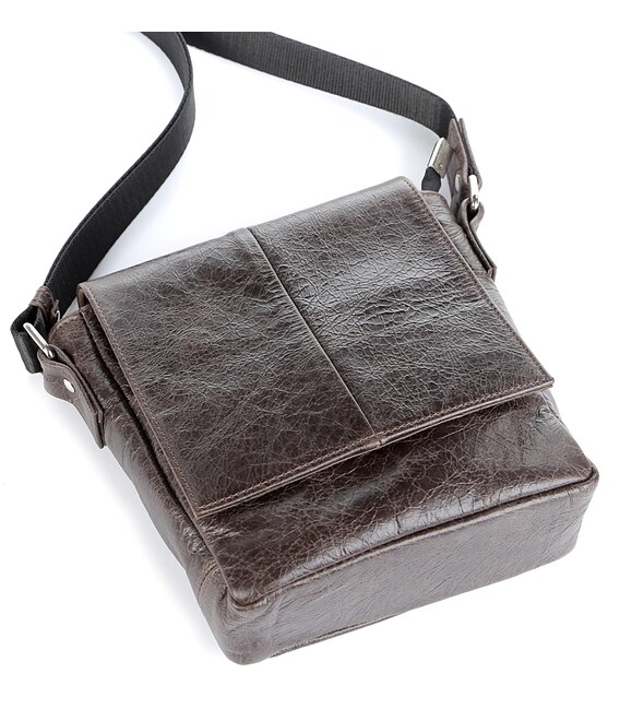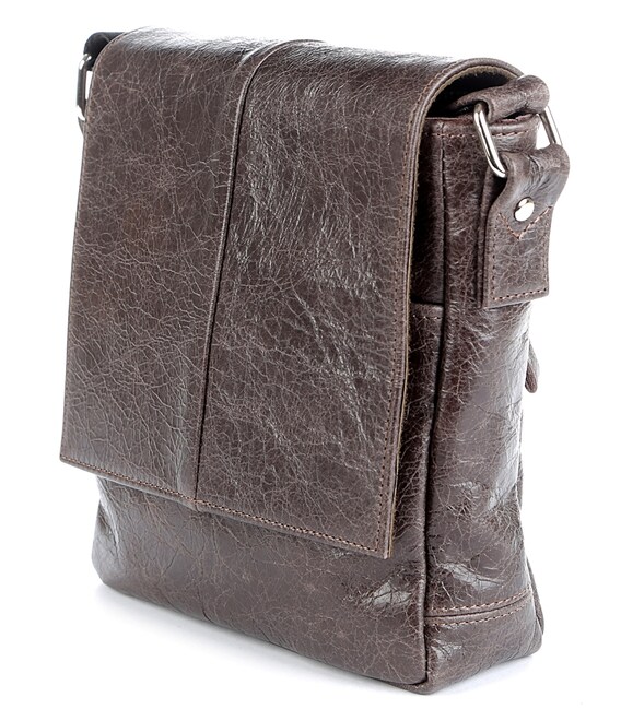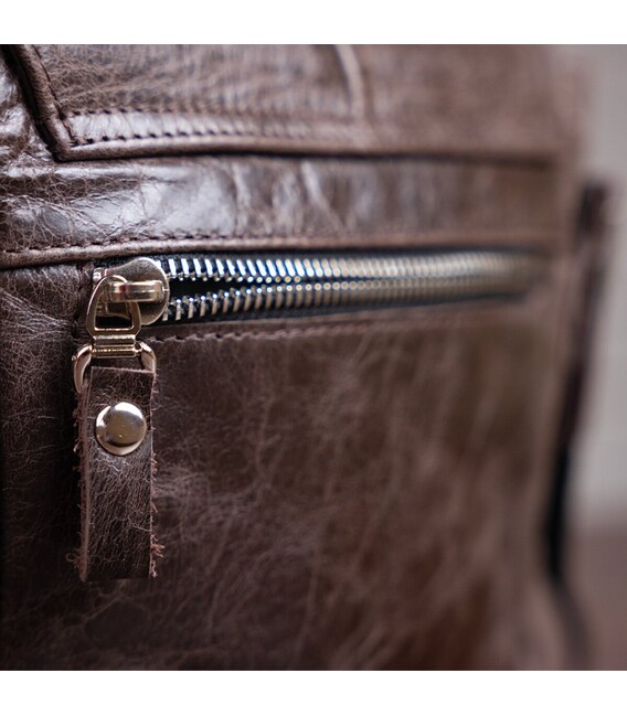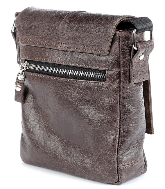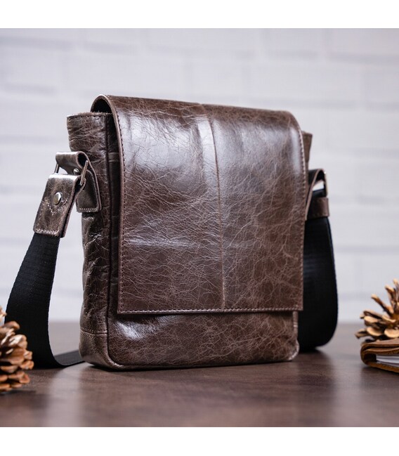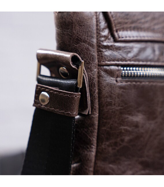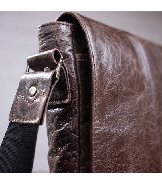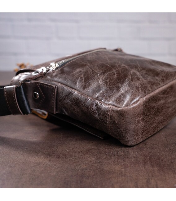 Оригінальна чоловіча сумка з натуральної високоякісної вінтажної шкіри. Колір фурнітури: срібло. На задній зовнішній стороні знаходиться відділення на блискавці, в яке можна помістити речі першої необхідності. Сумка закривається за допомогою клапана на двох прихованих магнітах і блискавкою. Під клапаном розташована накладна кишеня. Сумка носитися через плече за допомогою регульованого текстильного плечового ременя. Такий аксесуар є чудовим рішенням для подарунка чоловікові до будь-якого свята.
