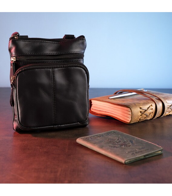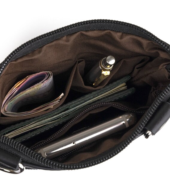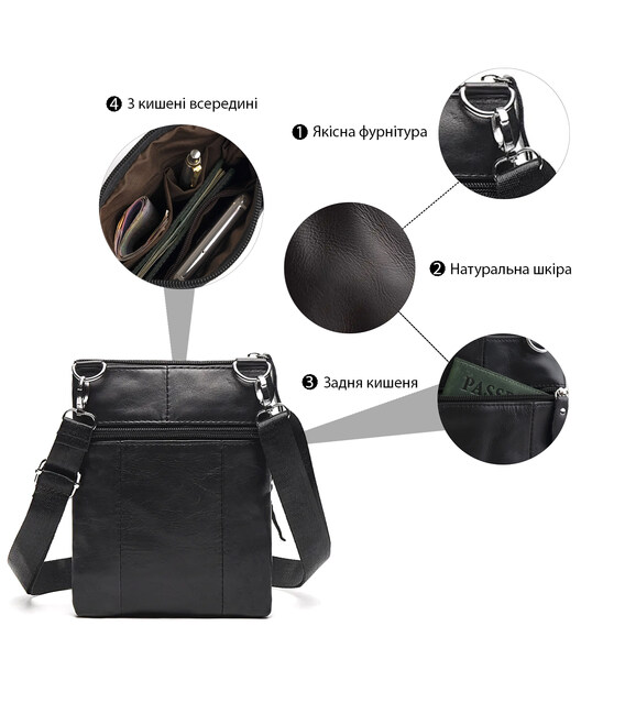 Компактна чоловіча шкіряна сумка для портмоне і документів. Відмінно підійде автомобілістам. Сумка закривається на блискавку. Підкладка виконана з міцного текстильного матеріалу. Всередині: потаємне відділення на блискавці і 2 накладні кишені для мобільних телефонів.