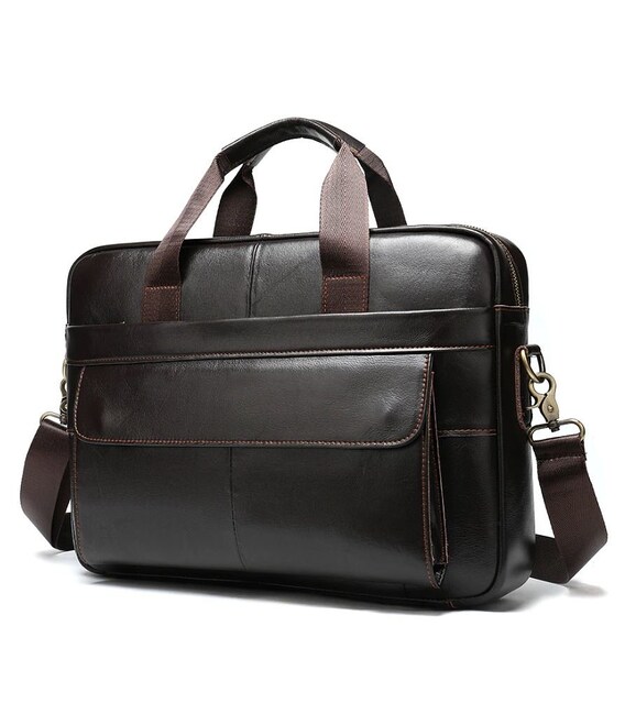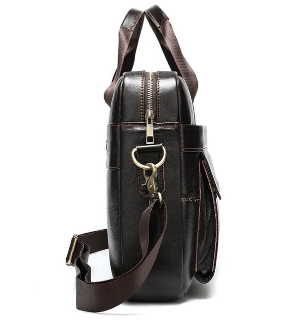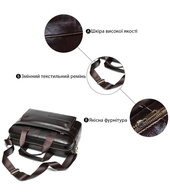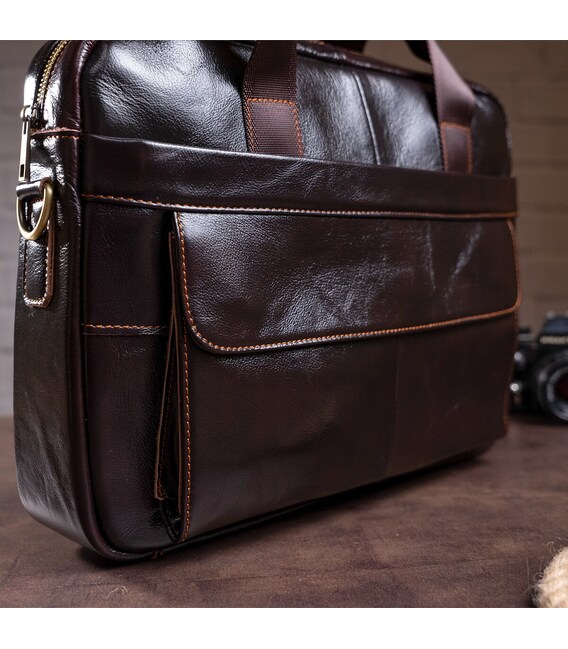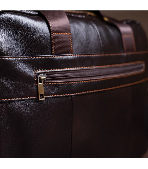 Солідна сумка для ділових чоловіків. Підкреслить ваш статус в суспільстві і відмінне почуття стилю. Аксесуар чудово впишеться в ваш діловий стиль. У сумці спокійно можна носити ноутбук і документи. Зручно носиться як в руках, так і на плечі за допомогою текстильної ручки. Дизайн аксесуара виготовлений в класичному стилі. Модель прошита рудою ниткою і доповнена золотистою фурнітурою. Буде чудовим подарунком для будь-якого чоловіка. Купуючи таку сумку, ви будете здивовані, як вона приємно носиться. Аксесуар упакований в тканинний чохол.