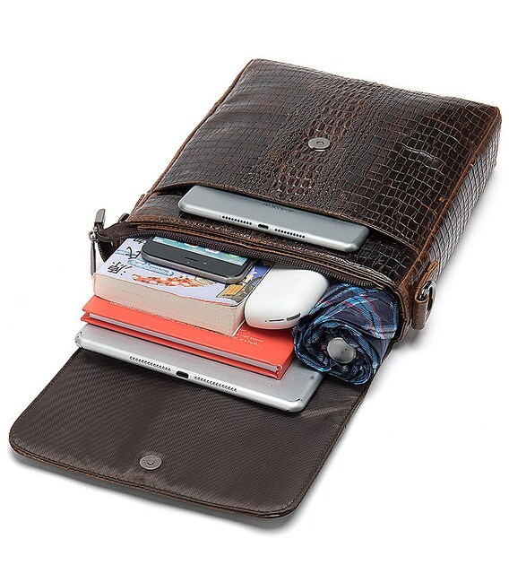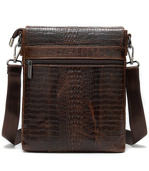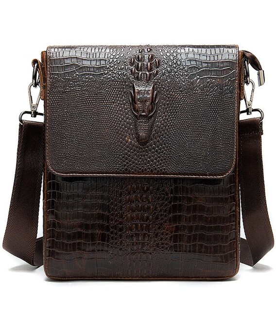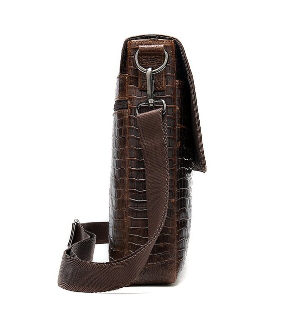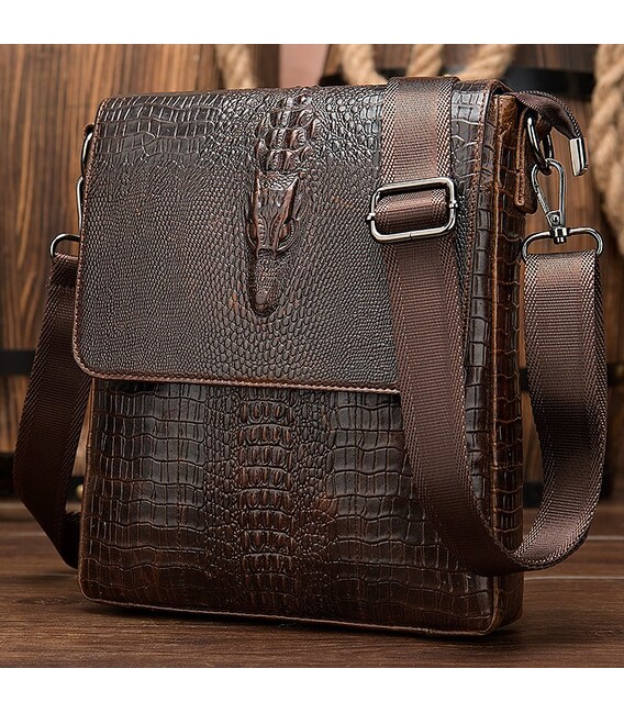Тонкий чоловічий месенджер з натуральної шкіри. Виріб має оригінальний дизайн з тисненням під екзотичну шкіру. Модель має тиснену опуклу голову крокодила на лицьовій стороні. Внутрішньо-коричнева текстильна підкладка. У сумці дуже зручно буде носити планшет. З нею буде також дуже зручно ходити на роботу або зустрічі. Якщо ви шукаєте невелику і якісну сумку на кожен день рекомендуємо придивитися до даної моделі. Впевнені, що переносите ви її досить довго. У комплекті йде пилозахисний чохол.
