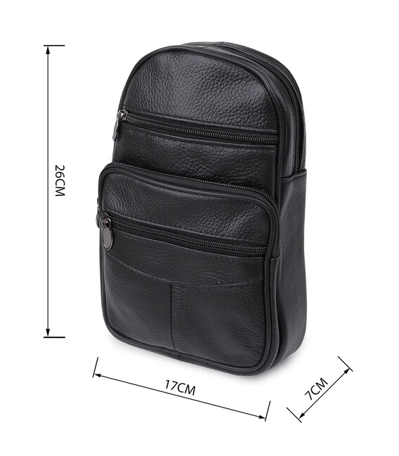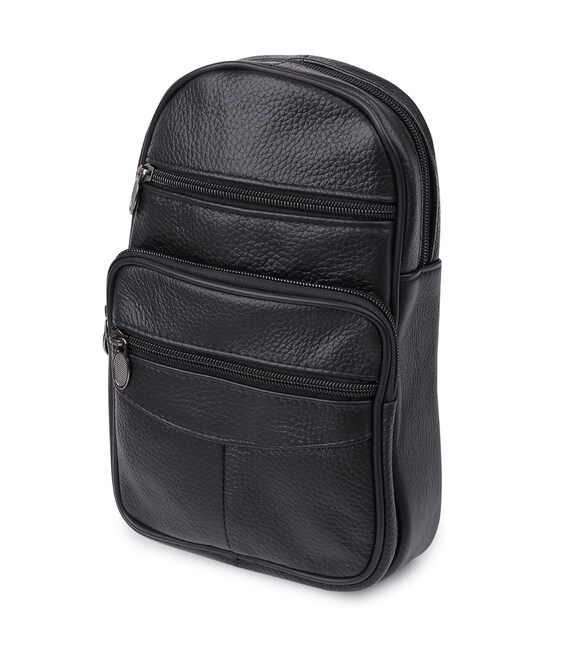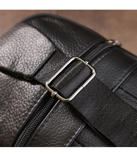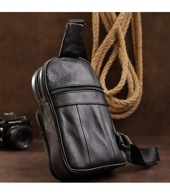 Компактна, але дуже містка чоловіча сумка через плече з натуральної шкіри високого класу з зернистою фактурою. Усередині одне просторе відділення на блискавці. На зовнішній стороні три кишені на блискавці. Також є одна кишеня на тильній стороні. Ремінь виготовлений з міцного текстилю і може регулюватися по довжині.