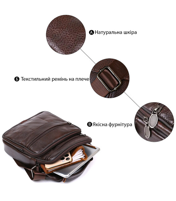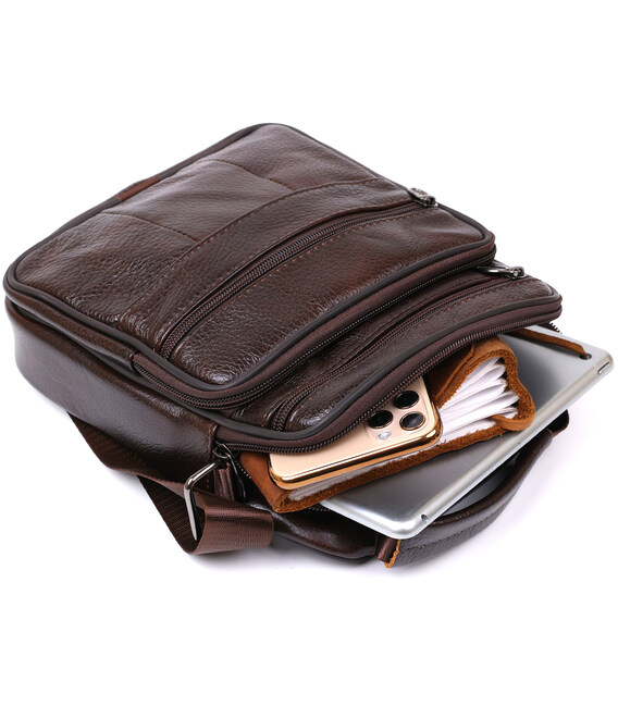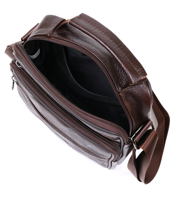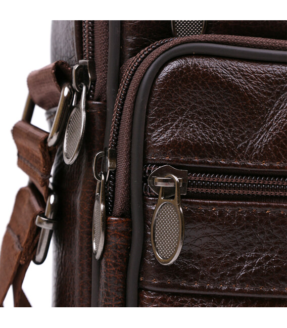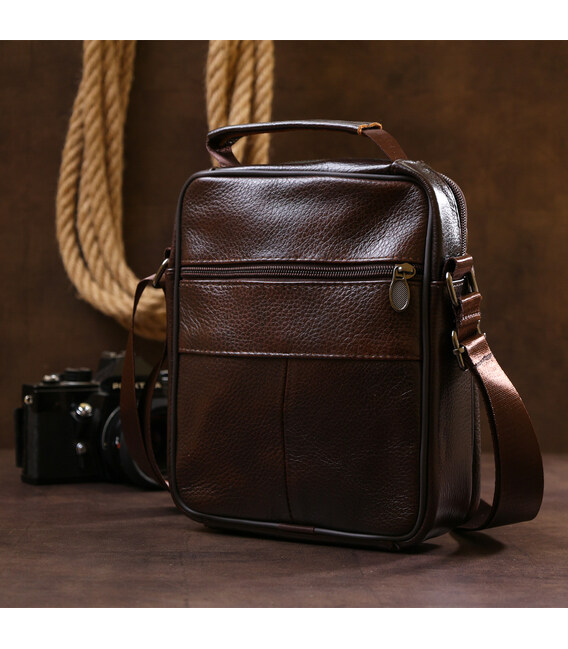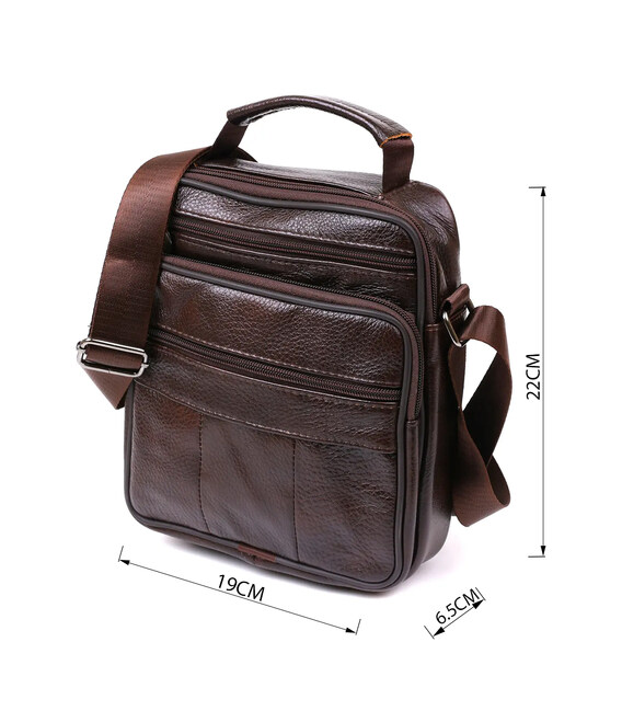 Відмінна невелика чоловіча сумка з висококласної натуральної шкіри з приємною на дотик зернистою фактурою. Має містке основне відділення та практичні додаткові кишені на зовнішній стороні для швидкого доступу до вмісту. Дана модель виконана в насиченому коричневому кольорі і виглядає дуже презентабельно. Її можна носити як на плечі, так і в руках.