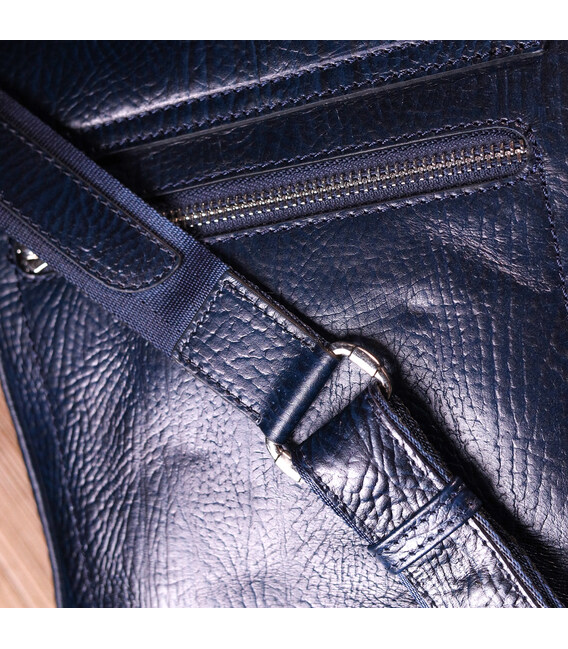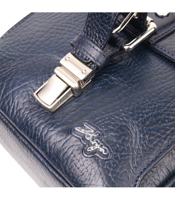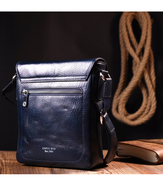 Чоловіча сумка синього кольору із натуральної зернистої шкіри високої якості. Аксесуар має надійну фурнітуру сріблястого кольору та міцну підкладку. Виріб упакований у фірмовий текстильний мішок Karya. Якісна чоловіча сумка з натуральної шкіри завжди була відмінним подарунком для чоловіка будь-якого віку.
