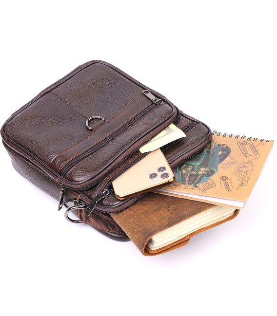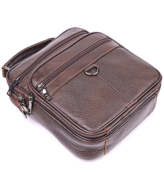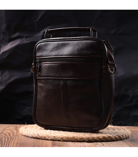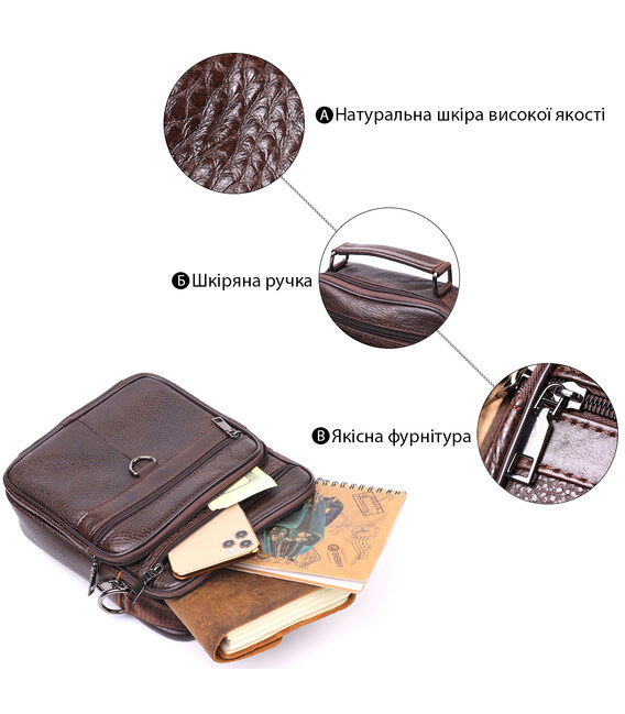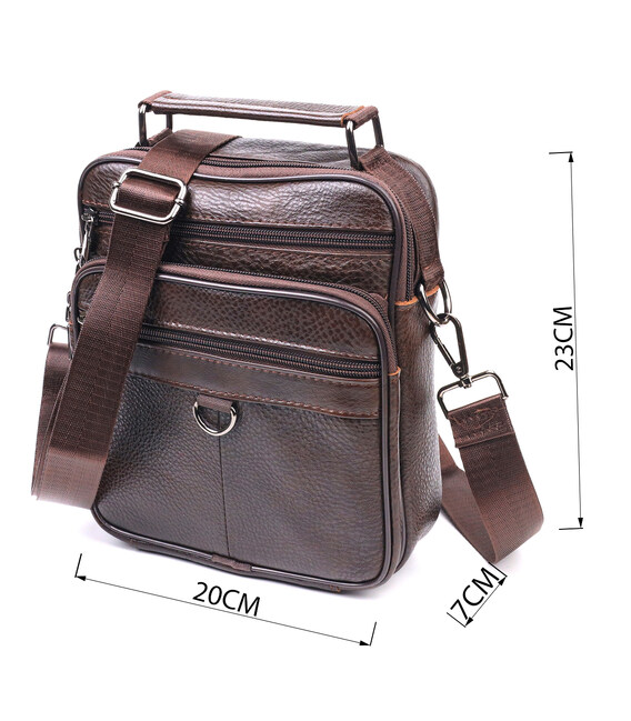 Коричнева чоловіча сумка середнього розміру із натуральної шкіри. Модель ідеально підійде на щодня. У сумку з легкістю помістяться всі необхідні речі. З такою сумкою зручно ходити на роботу або зустрічі. Доповнено виріб якісною фурнітурою, темно-срібного кольору. Сумка стане чудовим подарунком для близької людини.