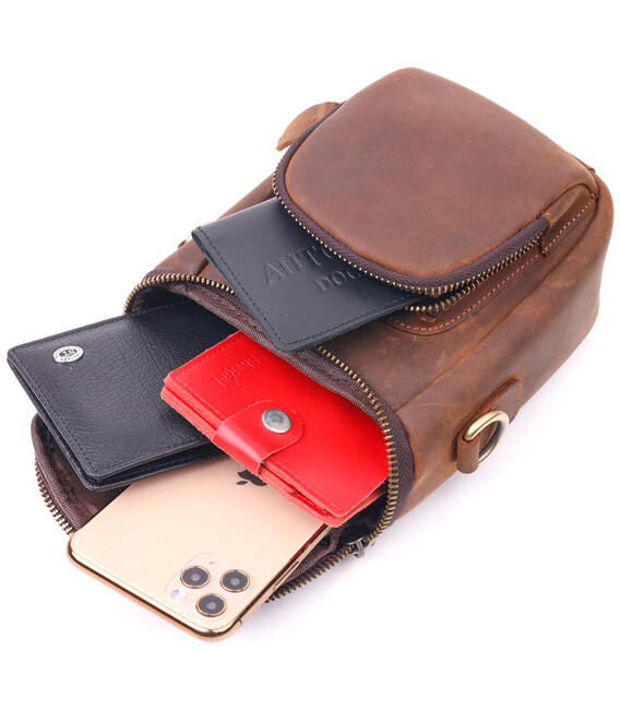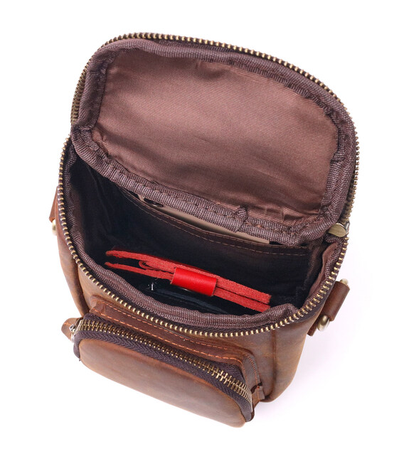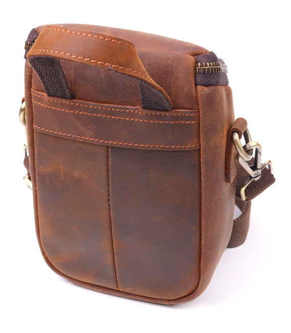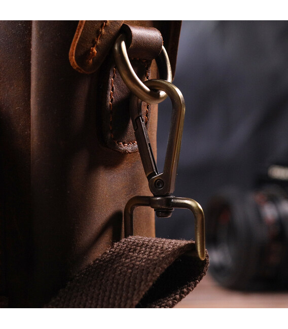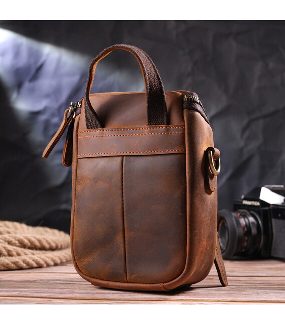 Чоловіча сумка невеликого розміру з натуральної вінтажної шкіри з відмінними характеристиками якості та зносостійкості. Аксесуар має не велике але містке основне відділення і дві додаткові кишеньки для дрібниць. Знімний плечовий ремінь можна регулювати по довжині, виконаний він із міцного текстилю. Колір фурнітури жовтий. Шкіряна сумка, завжди була чудовим подарунком для рідних та близьких людей.