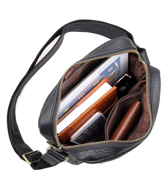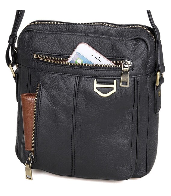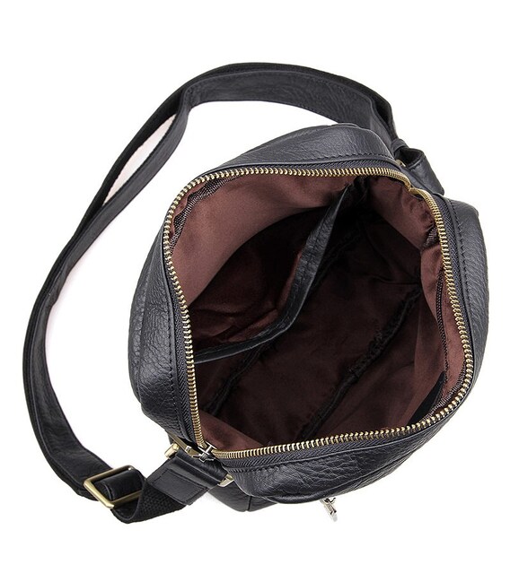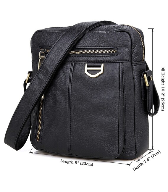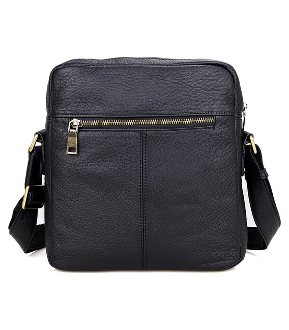 Добротна чоловіча сумка через плече з натуральної шкіри. Колір фурнітури: латунь. Сумка акуратно прошита міцною ниткою чорного кольору. На лицевій стороні розташовано два відділення на блискавці. Ще одне відділення на блискавці розташоване на задній зовнішній стороні. Дана модель закривається за допомогою блискавки. Сумка упакована в текстильний пилозахисний чохол білого кольору.