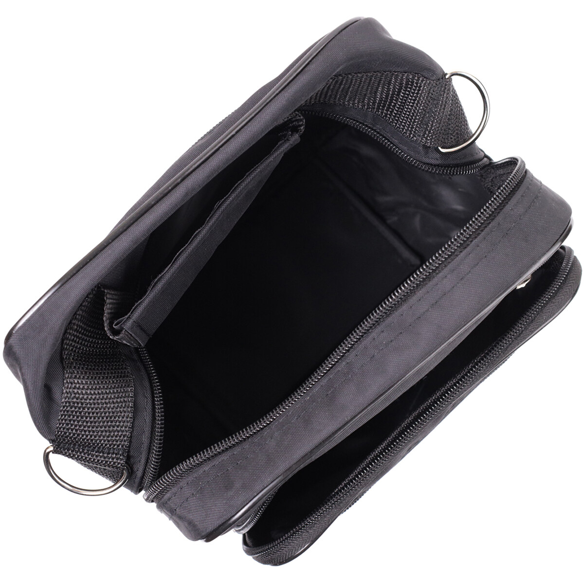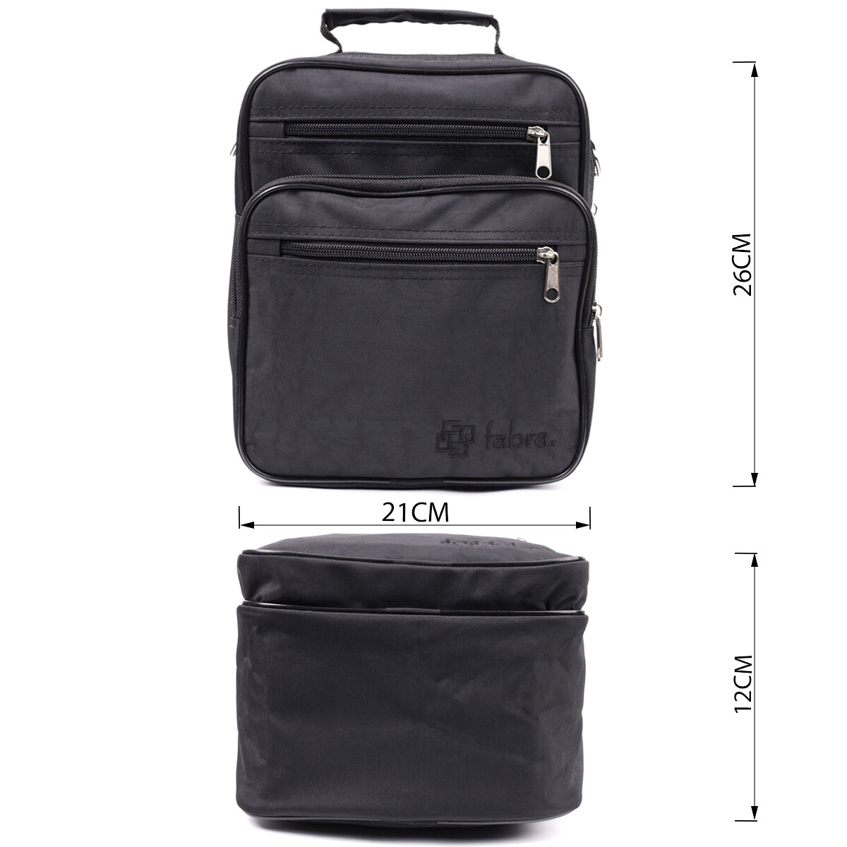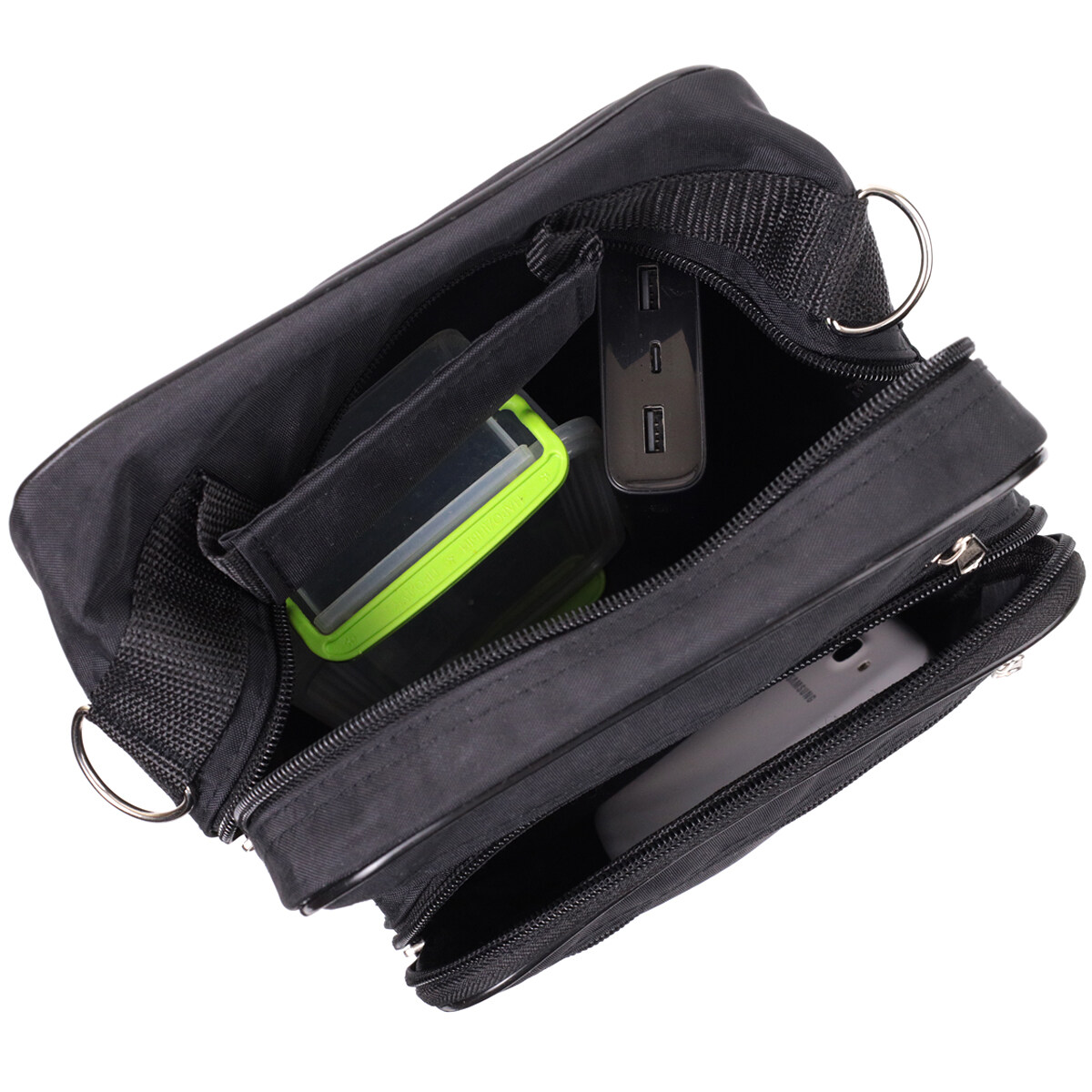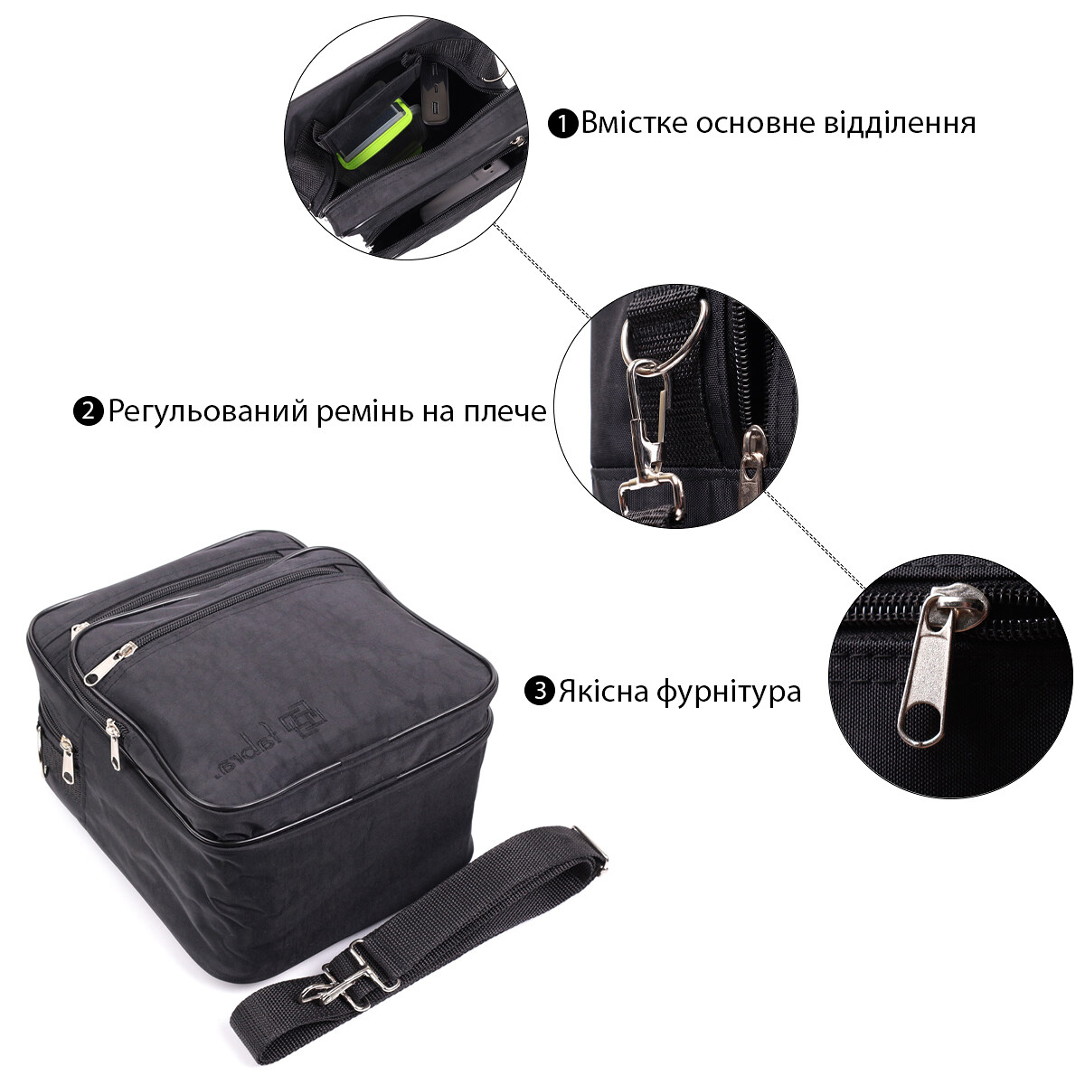 Сумка має одне основне відділення, яке закривається на блискавку. На лицьовій стороні розташовані три кишені на блискавках, а на тильній стороні передбачена додаткова кишеня на блискавці для речей, які мають бути під рукою. Такий набір відділень дозволяє зручно розмістити документи, телефон, гаманець, ключі та інші необхідні дрібниці.