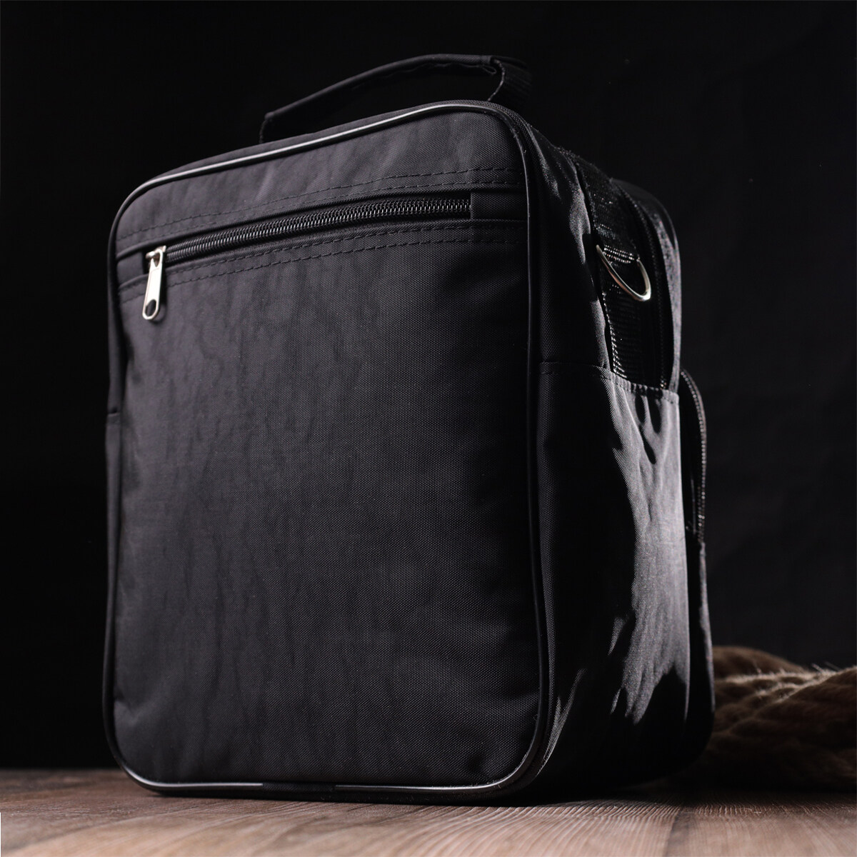 Виріб виконаний із якісного поліестеру чорного кольору. Матеріал відрізняється міцністю та зносостійкістю, тому добре підходить для активного повсякденного використання. Універсальний чорний колір робить модель вдалим вибором для міського, повсякденного і ділового стилю.