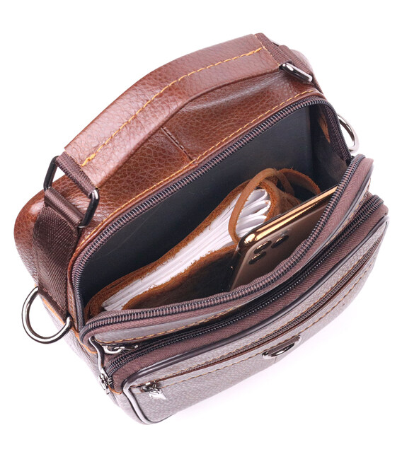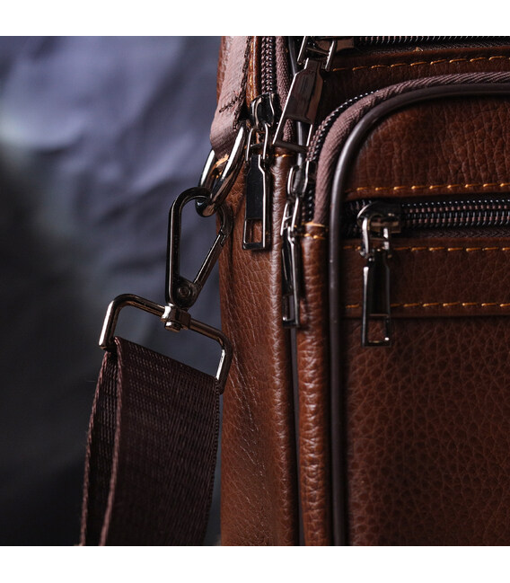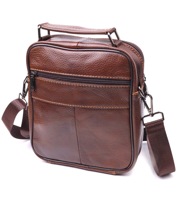 Багатофункціональна чоловіча сумка середнього розміру із натуральної шкіри. Модель, яка ідеально підійде на кожен день. В аксесуарі одне основне відділення та п'ять кишень різних розмірів, сумку можна носити як у руці, так і на плечі. У сумку з легкістю помістяться всі необхідні речі. З таким аксесуаром усі Ваші речі будуть гаразд, з ним також буде зручно ходити на роботу чи зустрічі. Доповнено виріб якісною фурнітурою, темно-срібло кольору. Сумка стане чудовим подарунком для близької людини.