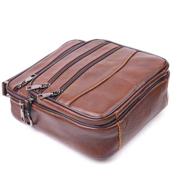 Практична чоловіча сумка середнього розміру із натуральної шкіри. Модель, яка ідеально підійде на кожен день. У сумку з легкістю помістяться всі необхідні речі. З такою сумкою усі Ваші речі будуть в порядку, з нею також буде зручно ходити на роботу чи зустрічі. Доповнено виріб якісною фурнітурою, темно-срібло кольору. Сумка стане чудовим подарунком для близької людини.