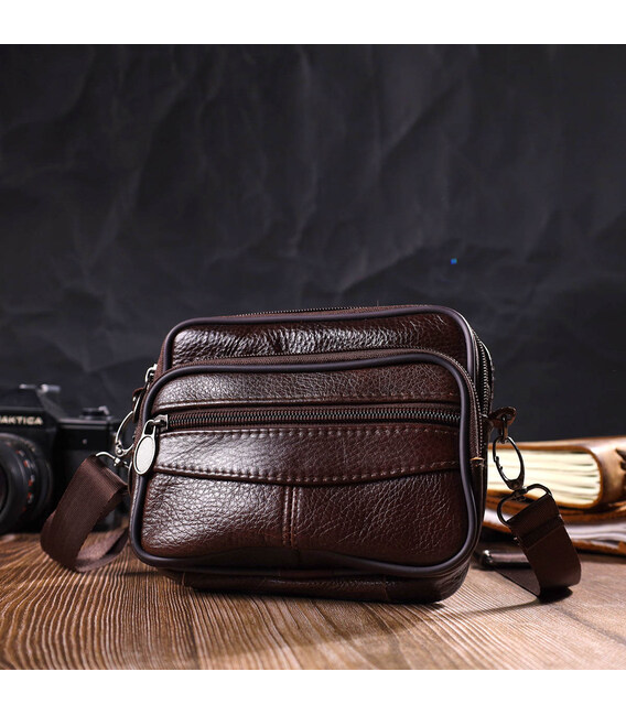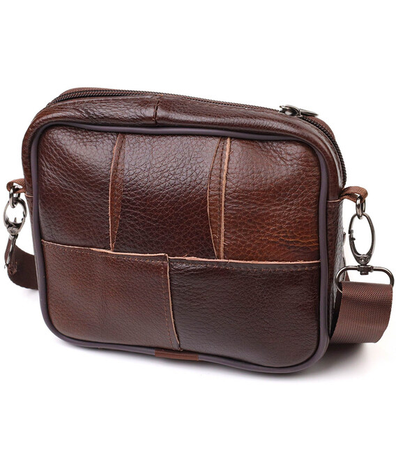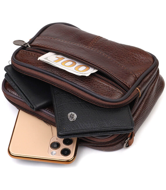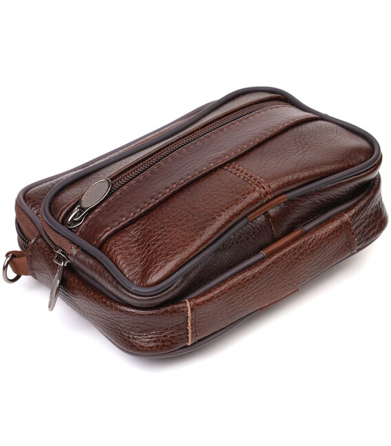 Зручна горизонтальна чоловіча сумка на пояс невеликого розміру з натуральної шкіри. Аксесуар чудово підійде як для роботи, так і в дорогу. Сумка складається з основного відділення, що закривається на блискавку та двох кишень зовні, вони також закриваються блискавками. Носити сумку можна на поясі, є спеціальна шкіряна петелька з тильного боку, а також в комплекті йде текстильний знімний плечовий ремінець. Модель дуже практична та універсальна. Виріб стане чудовим подарунком для будь-якого чоловіка.