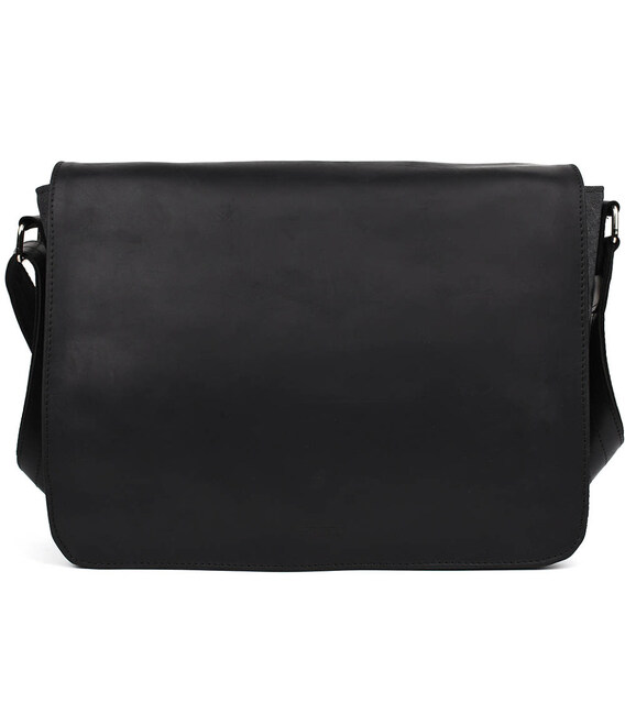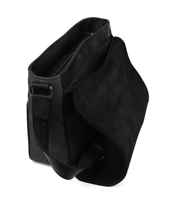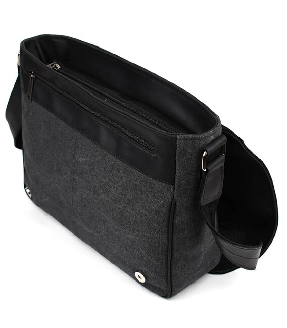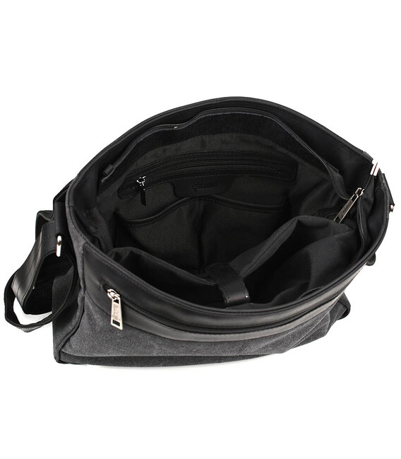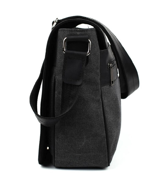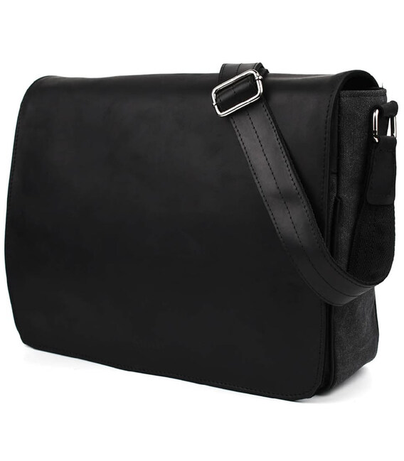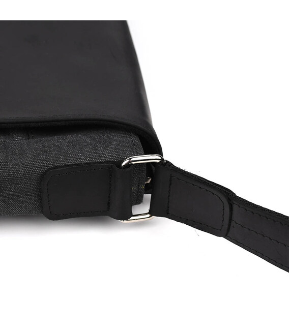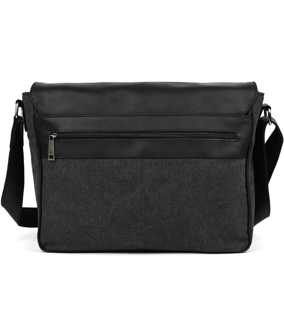 Сумка чоловіча через плече зі шкіри та канвас TARWA RAG-1047-3md - клапан із чорної шкіри крейзі хорс, корпус сумки із канвасу кольору антрацит. В основному відділенні може поміститися ноутбук до 14" і документи формату А4. Широкий шкіряний ремінь на плечі з регулюванням довжини. Під клапаном основне відділення, кишеня на блискавці на передній стороні і відкрита кишеня на всю ширину сумки біля основи клапана.