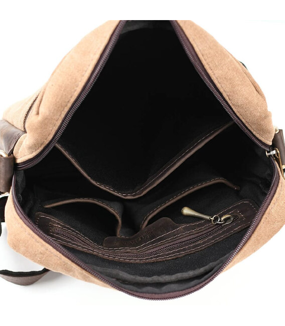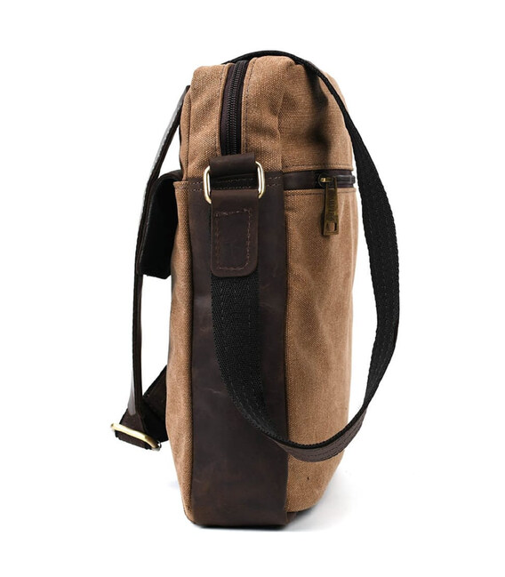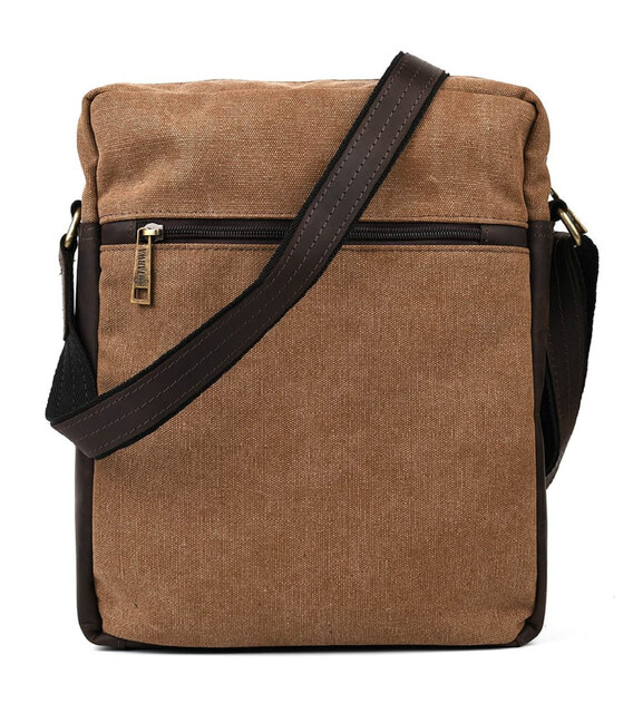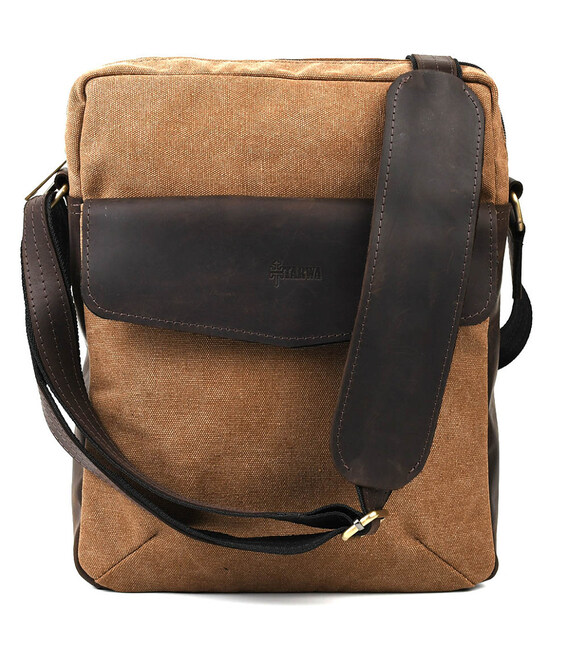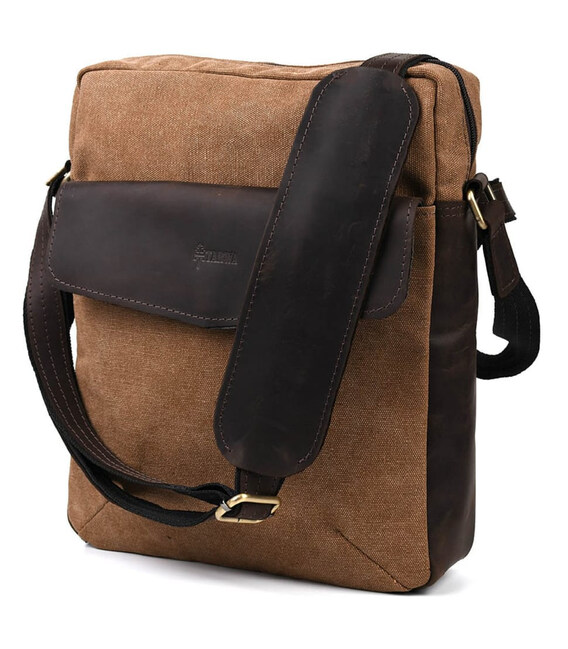 Вертикальна модель чоловічої сумки із канвас зі шкіряними вставками зі шкіри крейзі хорс RCc-1810-4lx від бренду Tarwa. Підходить для повсякденного носіння, для навчання та роботи. Вміщує формат А4. Незнімний ремінь на плечі з шкіряним наплічником. Якісна блискавка та металева фурнітура. Сумка із канвасу коричневого кольору, виробництво України.