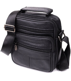 Компактна чоловіча сумка з високоякісної натуральної шкіри, яка стійка до різних пошкоджень та зносу. Має одне основне відділення та чотири додаткові кишені для різних аксесуарів. Ремінь виконаний із міцного текстилю та регулюється по довжині. Класичний чорний колір доповнює практичність моделі та робить її чудовим вибором на кожен день.