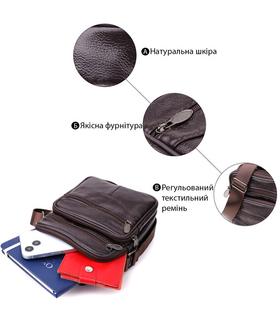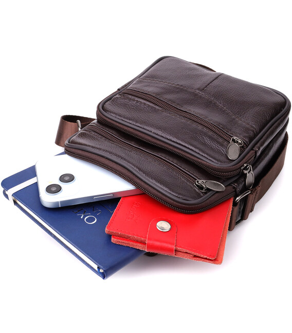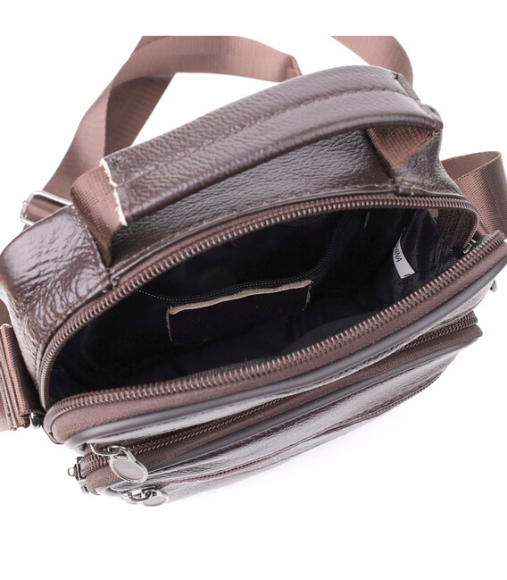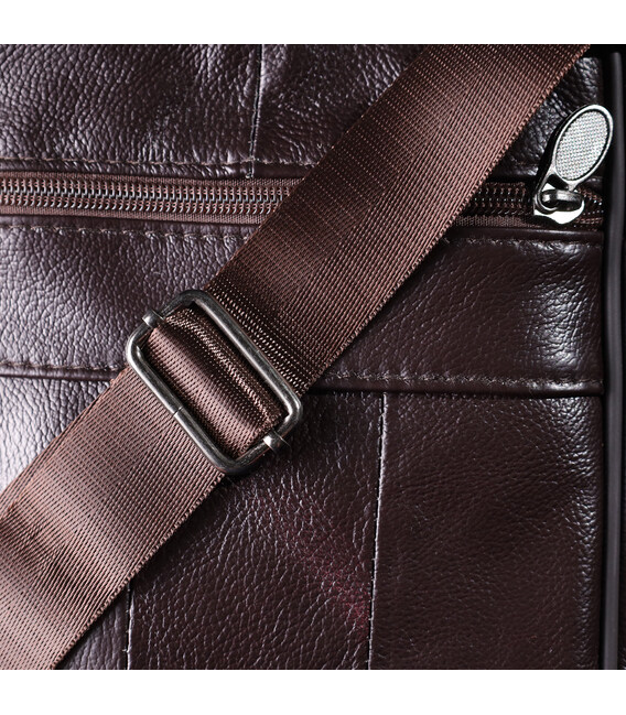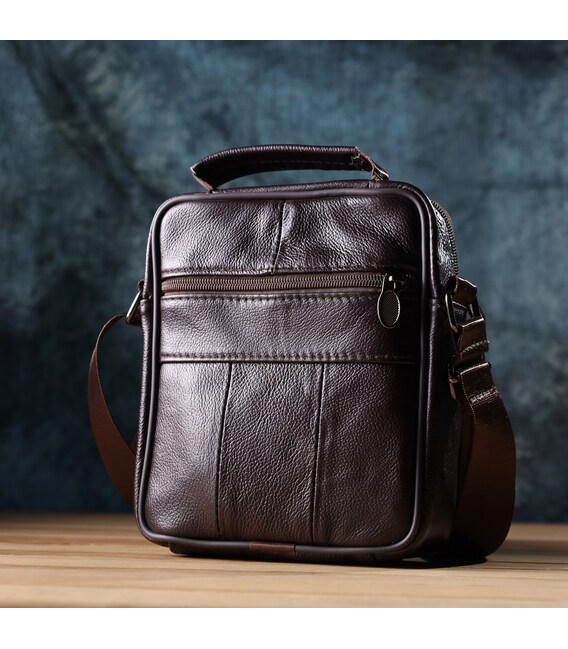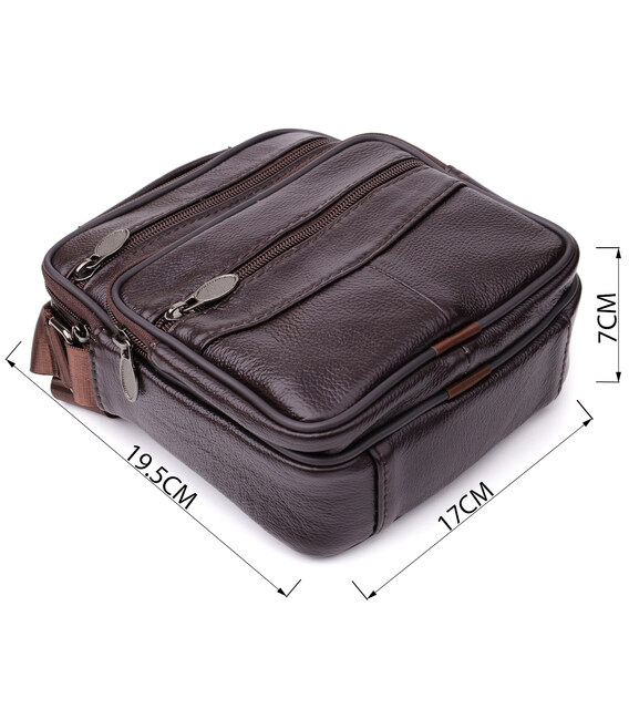 Зручна чоловіча сумка з високоякісної натуральної шкіри, стійка до зносу та дрібних пошкоджень. Модель оснащена одним містким основним відділенням та чотирма додатковими кишенями, які забезпечують зручне зберігання аксесуарів, документів, телефону та інших необхідних речей. Регульований плечовий ремінь виконаний із міцного текстилю, що гарантує комфорт при носінні, а також дозволяє підібрати оптимальну довжину. Коротка ручка робить сумку зручною для перенесення у руці. Красивий коричневий колір надає моделі універсальності та стилю, роблячи її чудовим вибором на кожен день як для ділових зустрічей, так і для повсякденного використання.