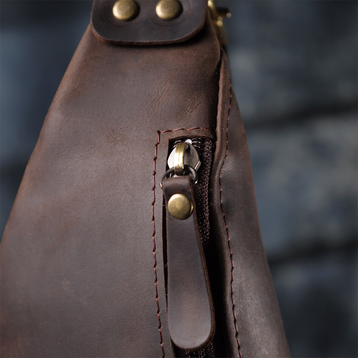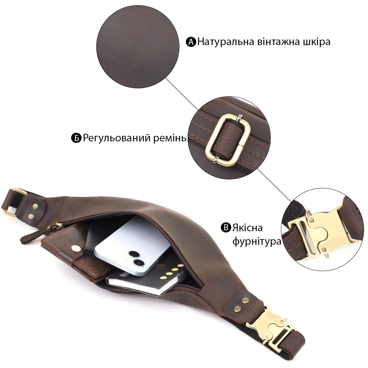 Чоловіча сумка-бананка з вінтажної коричневої шкіри стиль і практичність в одному аксесуарі. Ця сумка-бананка виконана із міцної натуральної вінтажної шкіри, яка надає їй характерного теплого відтінку та благородної текстури. Глибокий коричневий колір підкреслює природну красу матеріалу і робить виріб особливо виразним.