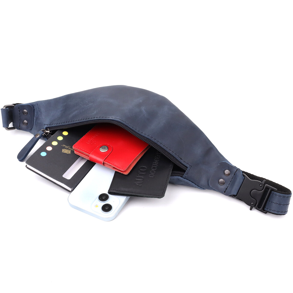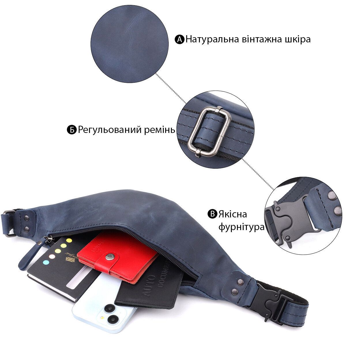 Сумка-бананка Shvigel із натуральної вінтажної шкіри у стильному синьому кольорі. Ця чоловіча бананка від українського бренду Shvigel — ідеальне поєднання витонченого дизайну, продуманої функціональності та впізнаваного стилю. Модель виконана з натуральної шкіри з вінтажною фактурою та представлена в глибокому синьому кольорі, що надає аксесуару свіжого, благородного та сучасного вигляду.