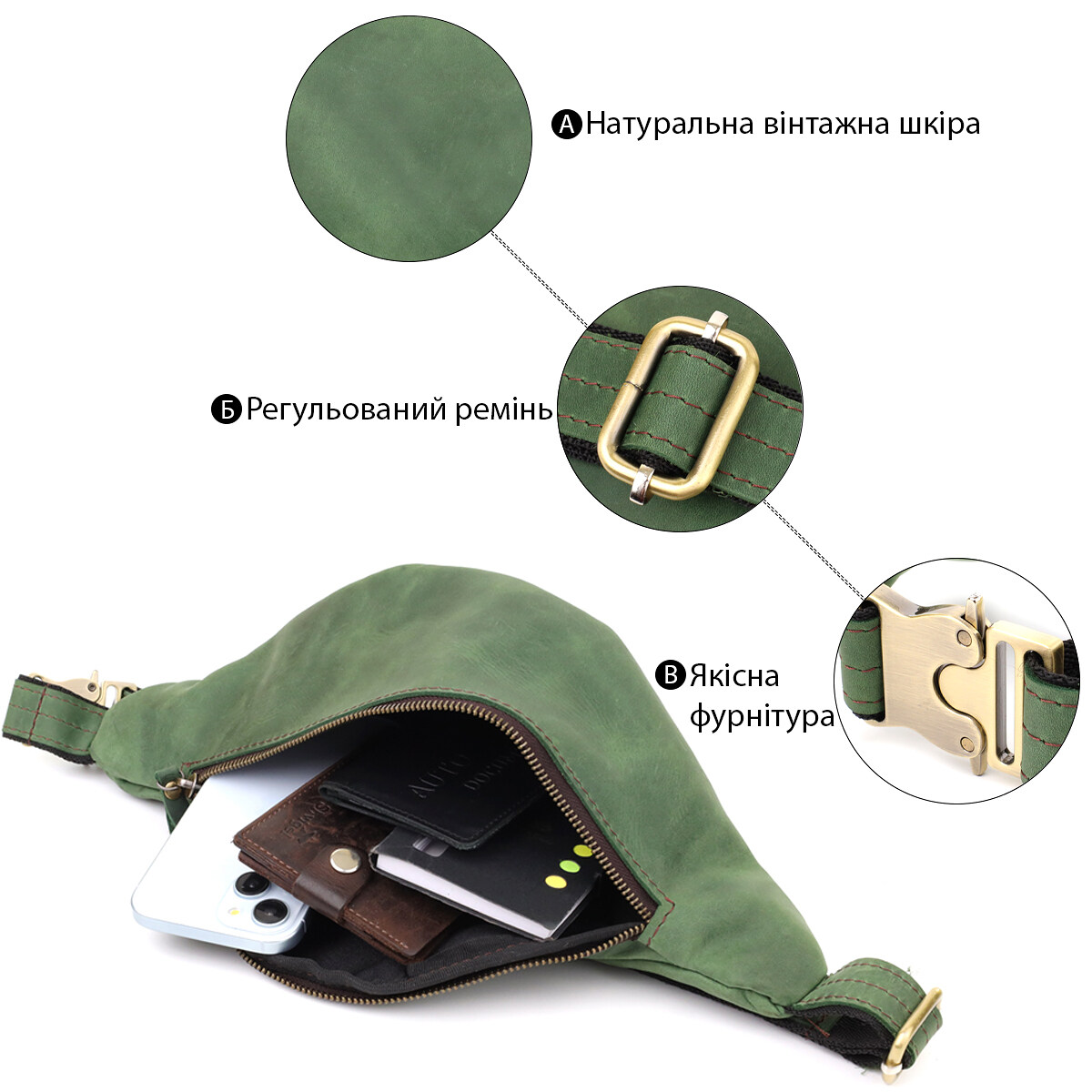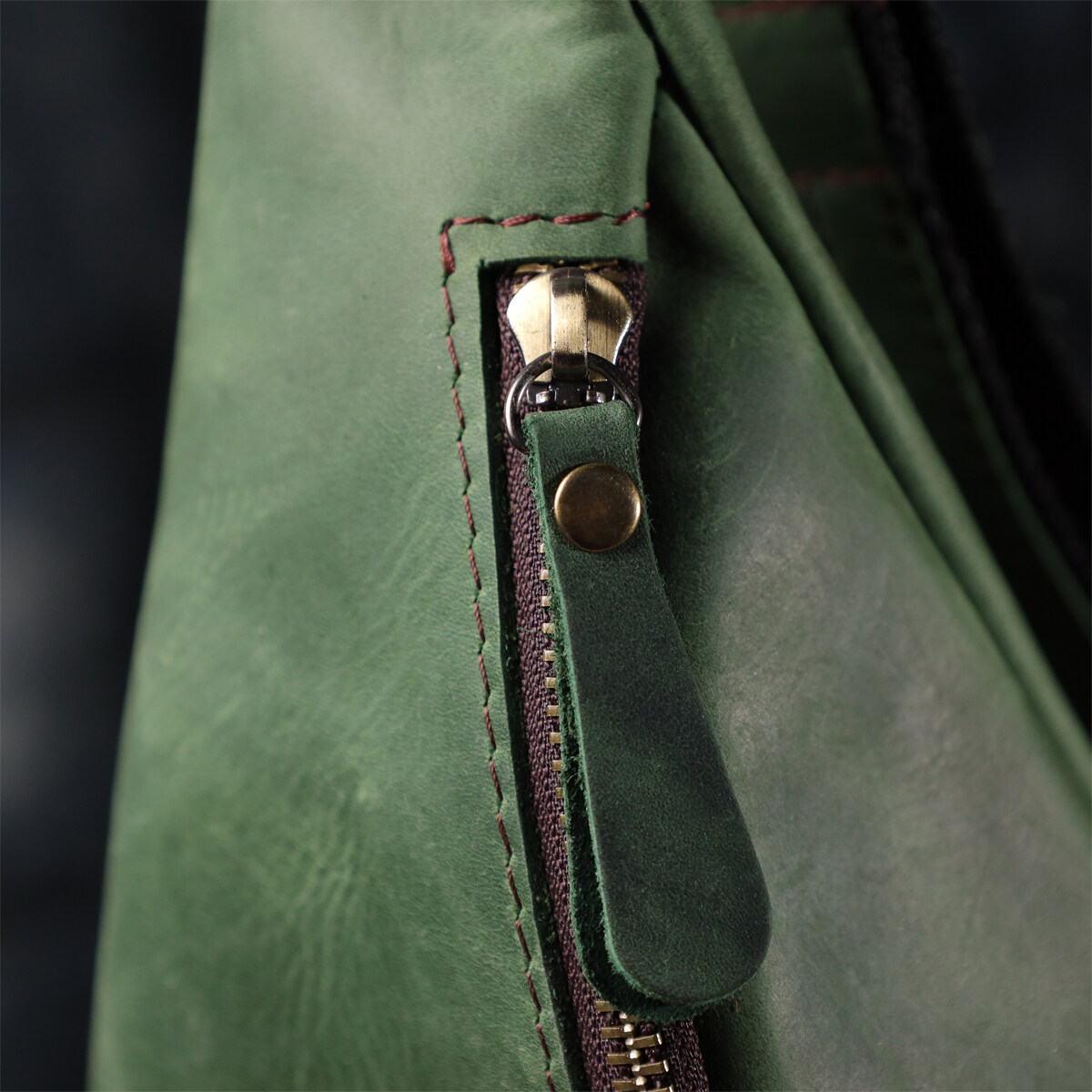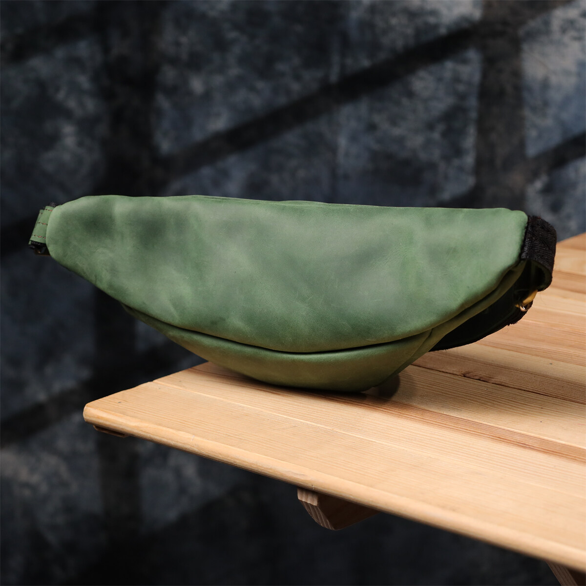 Чоловіча сумка-бананка від українського бренду Shvigel – вдале поєднання практичності, стилю та індивідуальності. Виконана із міцної натуральної вінтажної шкіри, вона представлена у глибокому зеленому кольорі, який вигідно виділяється серед звичних чорних та коричневих моделей. Такий відтінок надає аксесуару свіжості та шляхетності, підкреслюючи вашу оригінальність і впевненість у собі.