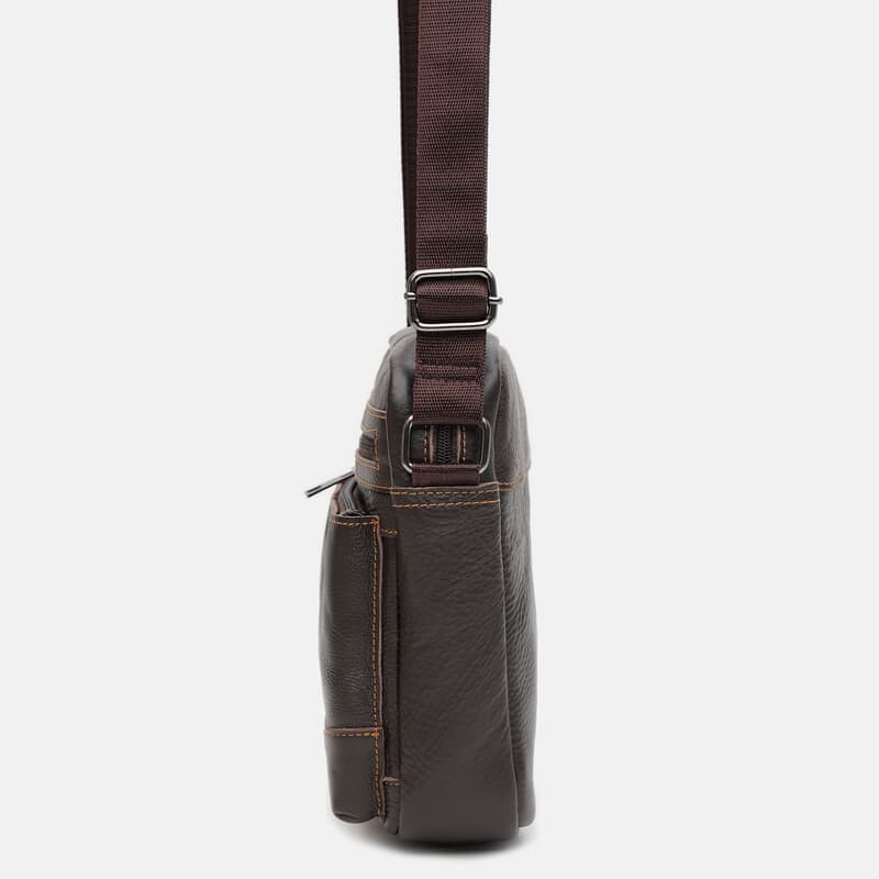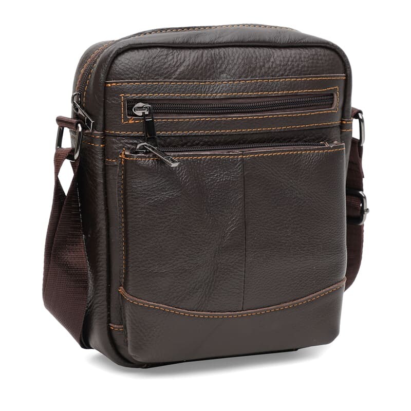 Чоловіча шкіряна сумка коричневого кольору стильний і популярний аксесуар на будь-який сезон. Має 1 відділення на блискавці. Всередині 1 кишеня на блискавці. Зовні 2 кишені на блискавці. Підкладка-текстиль. Колір фурнітури коричневий. Плечовий ремінь регулюється по довжині.
