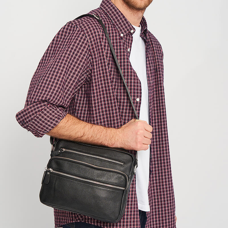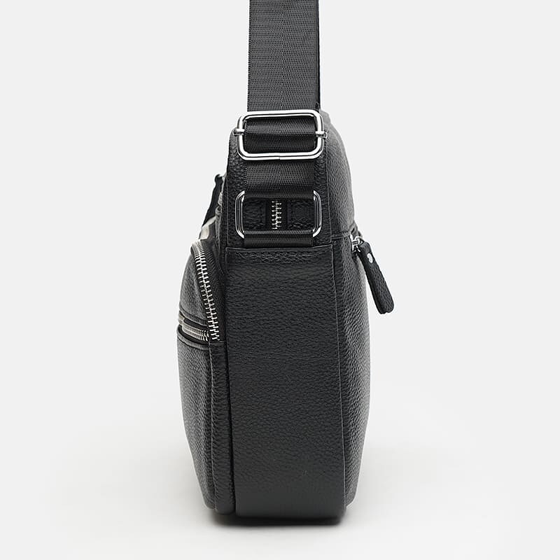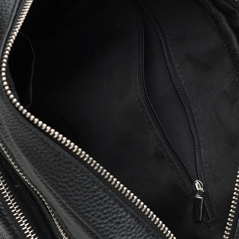 Сумка середнього розміру містка та компактна. Виконана із натуральної шкіри. Має 1 головне відділення. Всередині сумки 3 кишені для телефону та дрібниць. Зовні є 4 кишені на блискавці. Підкладка з текстилю. Колір фурнітури-срібло. З лицьового боку фурнітура метал. Незнімний плечовий ремінь регулюється по довжині.
