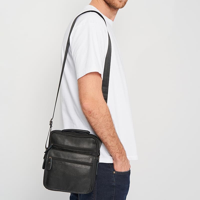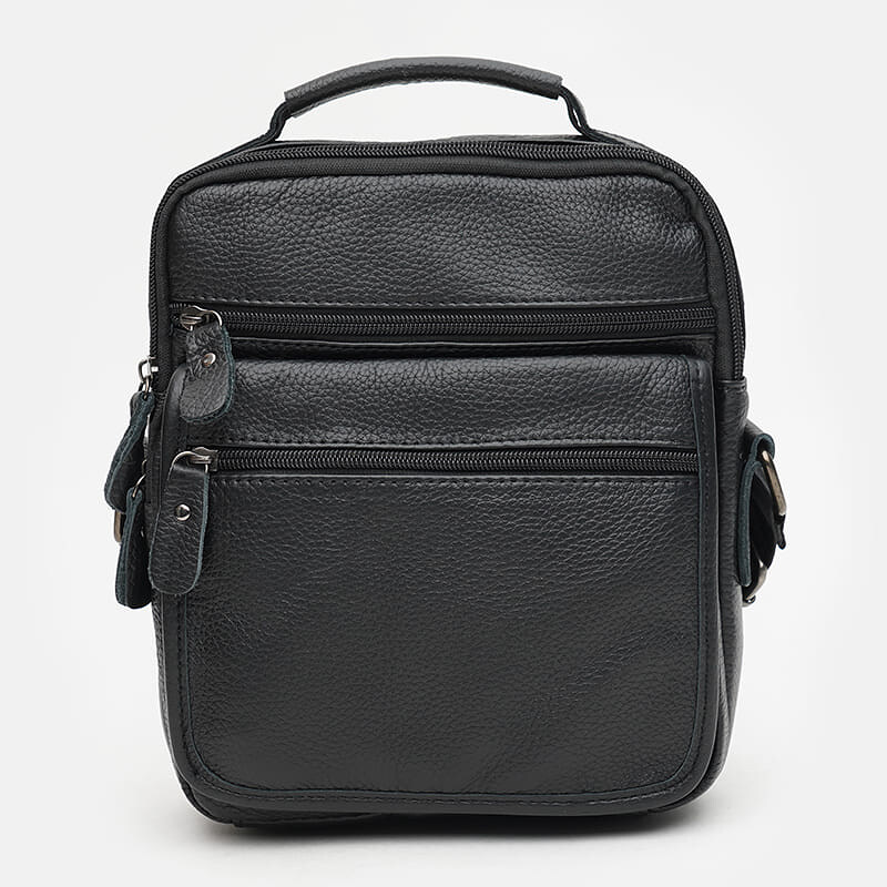 Чоловіча шкіряна сумка виготовлена з натуральної шкіри. Має 1 відділення на блискавці. Всередині 3 кишені для телефону та дрібниць. З лицьового боку 2 кишені на блискавці, з тильною 1 кишеня на блискавці. Підкладка-текстиль. Колір фурнітури-чорний. Є додаткова ручка та незнімний регульований плечовий ремінь.