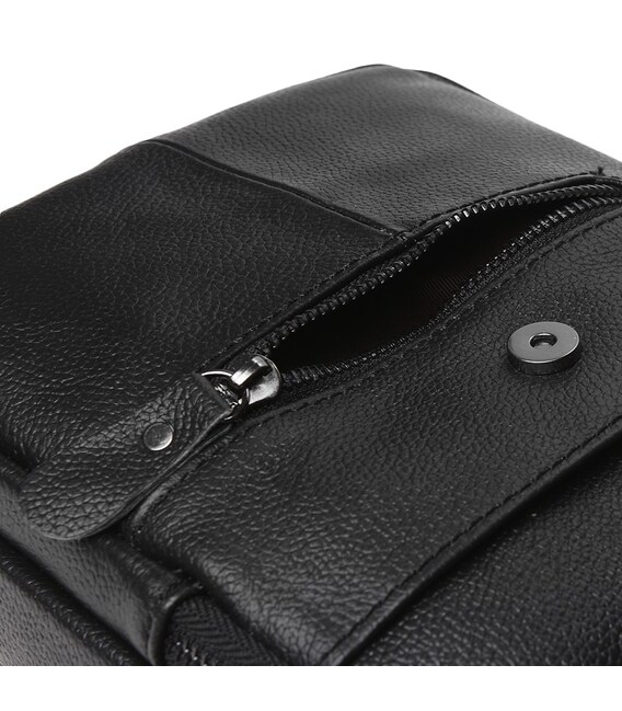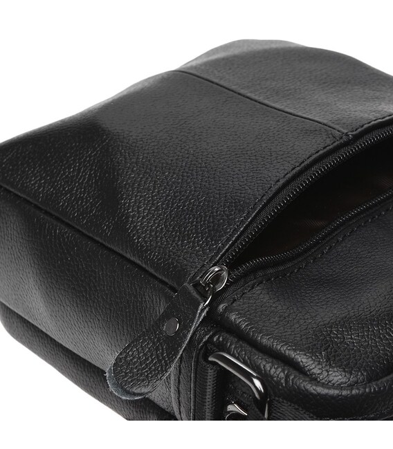 Шкіряна чоловіча сумка має два незалежних відсіки і кілька додаткових відділень, кожне з яких оснащено блискавкою. Накладка з магнітною застібкою додатково захищає від проникнення, а місткі кишені з лицьової і тильної сторін закриваються на змійку. Підкладка текстиль. Фурнітура- металева. Текстильний ремінь регулюється по довжині.