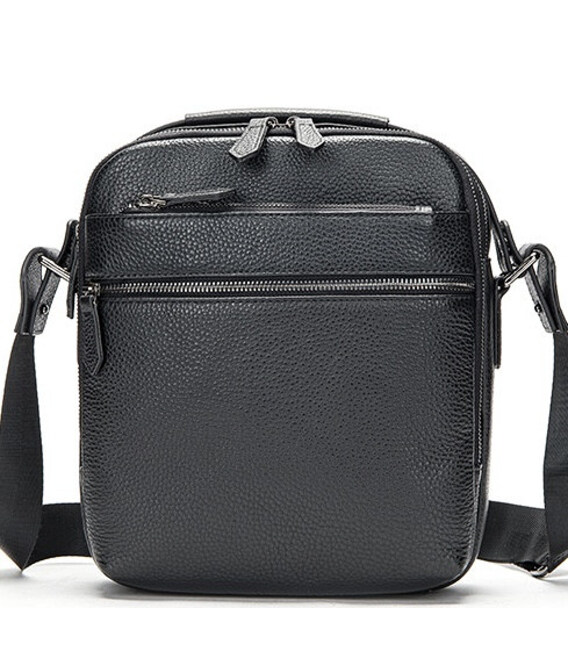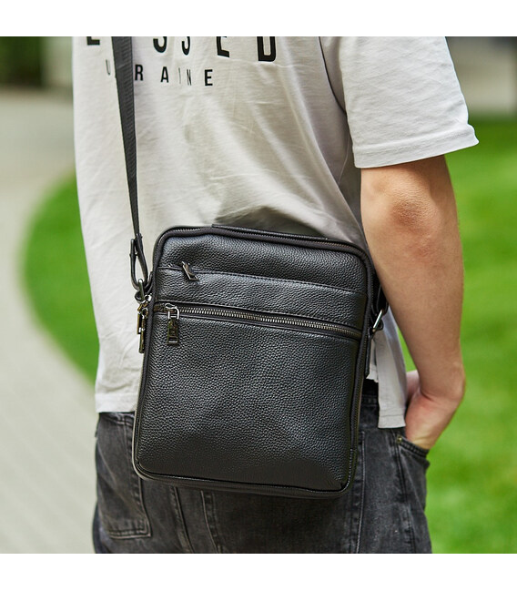 Сумка на плече з натуральної шкіри з зернистою матовою поверхнею. Основне відділення розташування в собі горизонтальний відсік відкритого типу і кишеню на блискавці. Ремінь на плече є вшитим, виконаний з щільного текстилю і регулюється по висоті. З лицьової частини дві кишені на блискавках, з тильної сторони один кишеню. Фурнітура сріблястого кольору. Модель є каркасною і відмінно тримає форму.