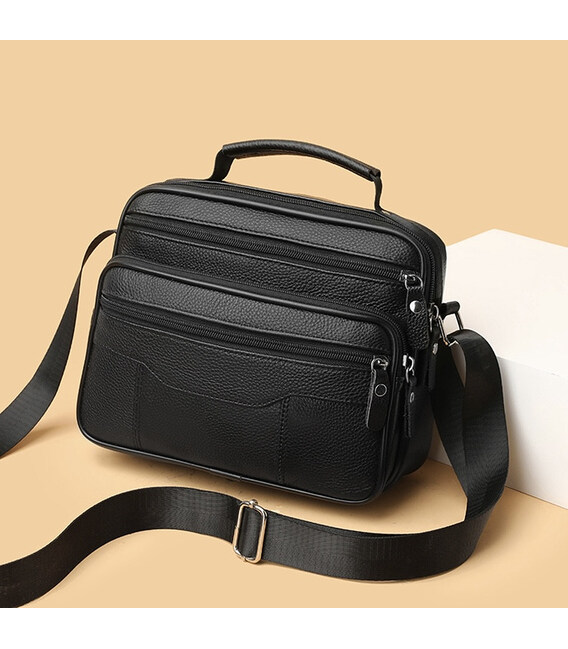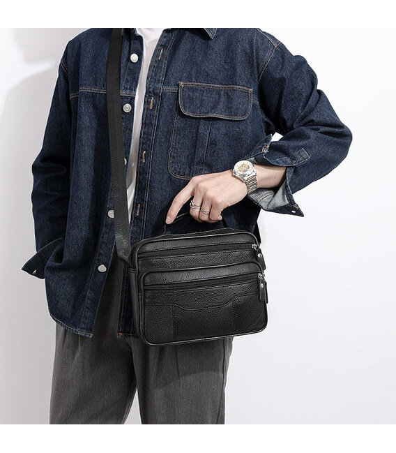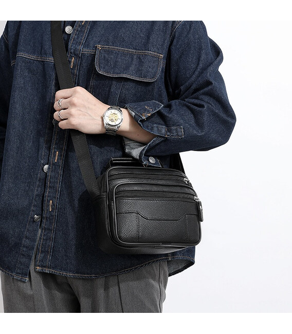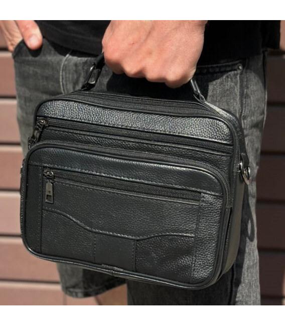 Компактна чоловіча сумка виготовлена з високоякісної натуральної шкіри. Сумка має одне основне відділення, в якому є потайна кишеня на блискавці, а також кишеня відкритого типу; та три передні кишені на блискавці. Має коротку ручку для зручності. Високоякісна фурнітура. Ремінь сумки щільний, регульований, з'ємний.