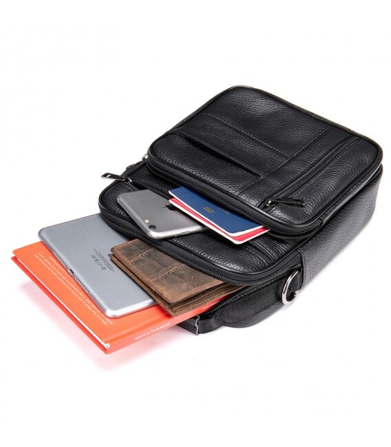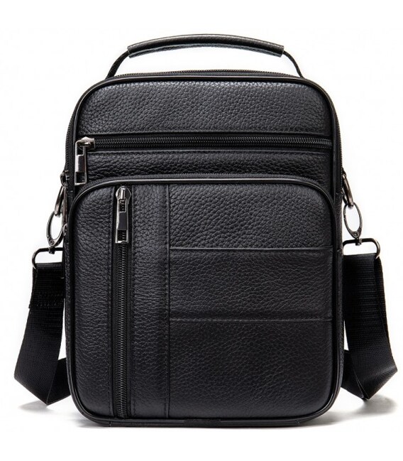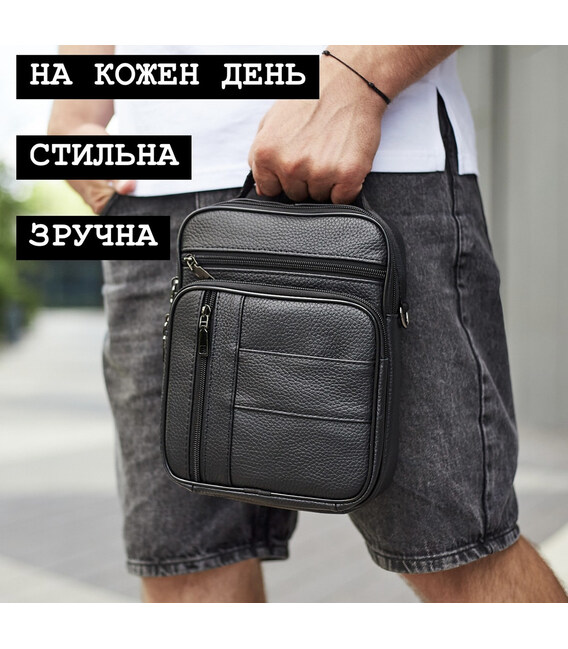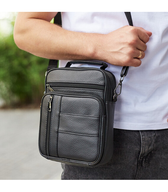 Лаконічна чоловіча сумка на плече виконана з високоякісної натуральної шкіри, м'якої на дотик. Виріб має два рівномірні основні відділення, всередині яких знаходяться бічна кишеня на блискавці, а також кишеня відкритого типу. Крім основних відділень, сумка має зовні також три додаткові відділення-кишені (з лицьової та тильної частини). Кожне відділення застібається за допомогою якісної фурнітури. Усередині сумка оброблена щільною підкладкою. Ремінець сумки щільний, регульований, знімний, а коротка зручна ручка в руці.