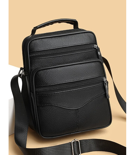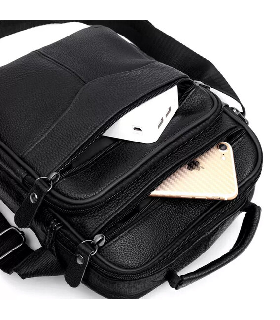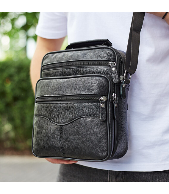 Чоловічий месенджер із натуральної шкіри, має насичений чорний колір і чудову металеву фурнітуру. Також модель обладнана довгим текстильним ременем, який регулюється за довжиною та м'якою шкіряною ручкою. Шкіряна чоловіча сумка з ручкою має два автономні відділення, які застібаються за допомогою блискавок. На тильній стороні сумки розташована одна кишеня на блискавці. На своїй лицьовій частині сумки розміщені: одна досить містка кишеня і дві додаткові допоміжні, які так само закриваються за допомогою блискавок.
