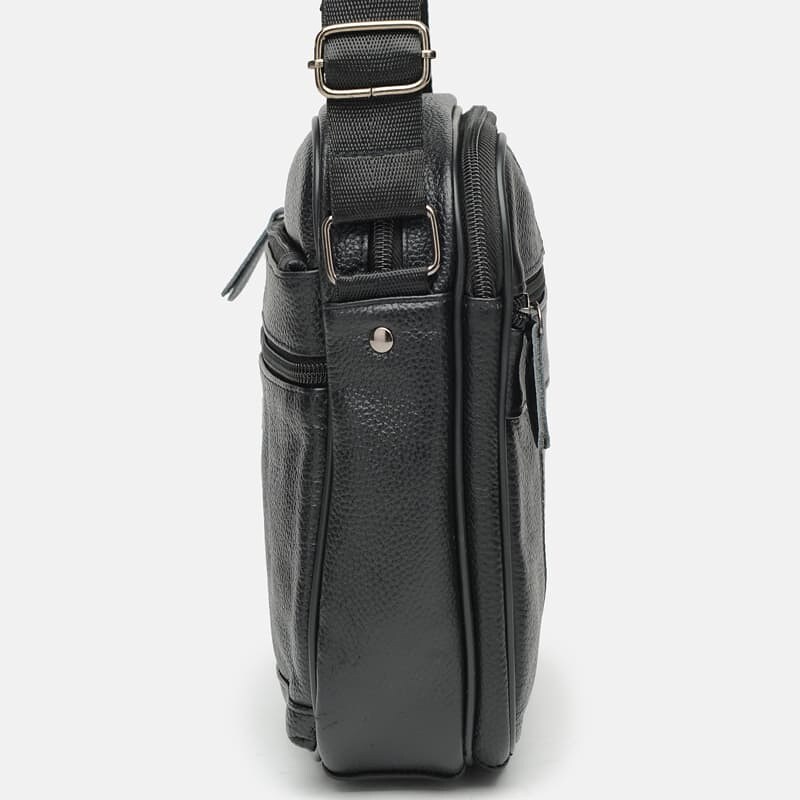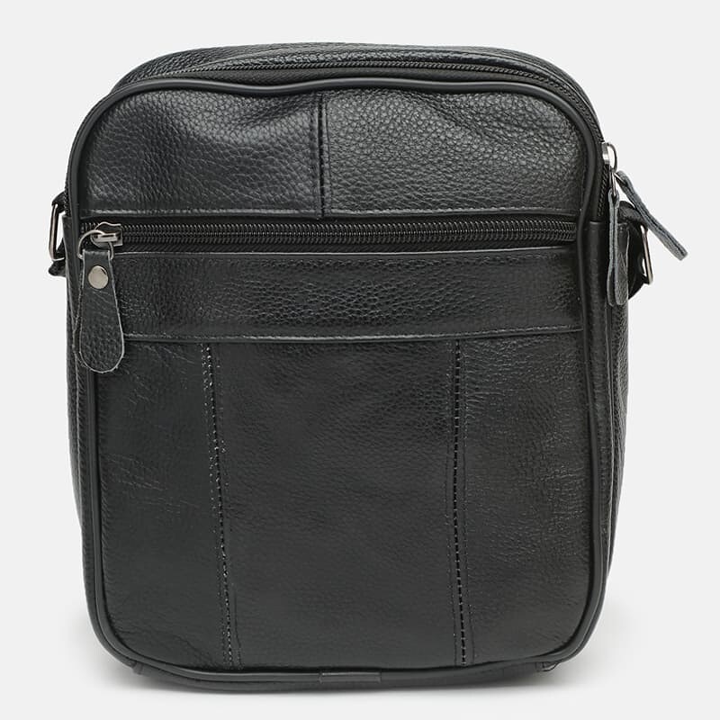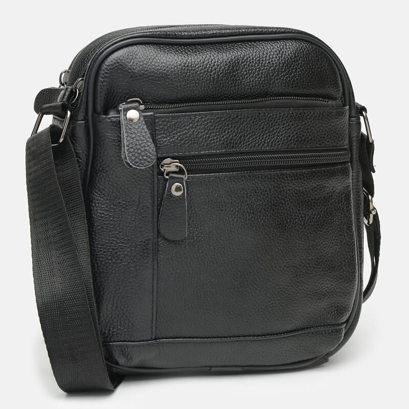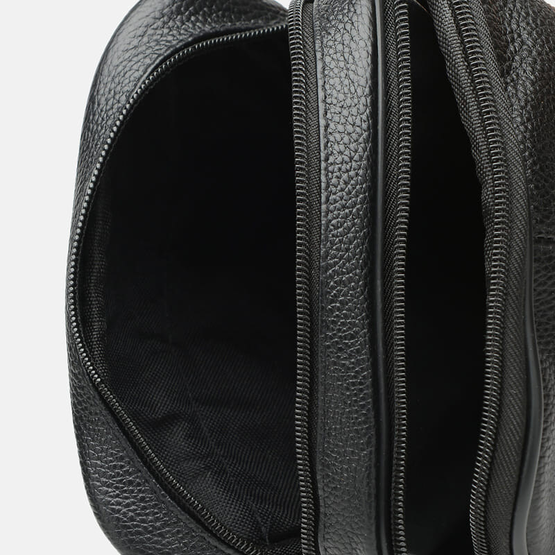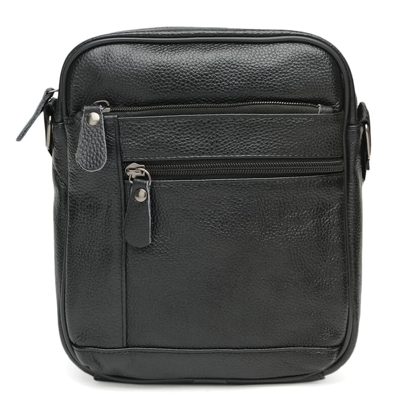 Практична модель чоловічої сумки зі шкіри. Має 2 відділення на блискавках. Усередині 1 кишеня на блискавці. З лицьового боку-2 кишені на блискавці. З тильного -1 кишеню на блискавки. Підкладка-текстиль. Незнімний плечовий ремінь регулюється по довжині.
