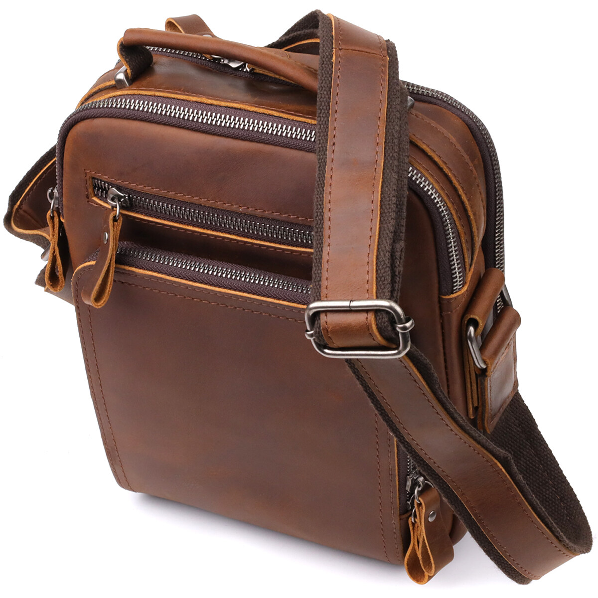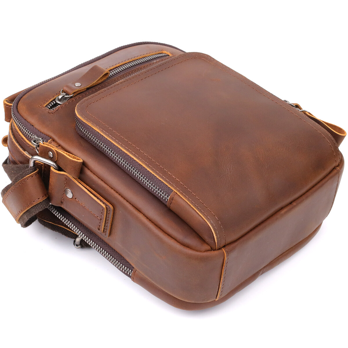 Коричнева шкіряна сумка через плече – стильний та практичний аксесуар на кожен день. Виготовлена з натуральної шкіри із виразною текстурою, доповнена фурнітурою кольору срібла. Модель оснащена двома основними відділеннями на блискавці, всередині – потайна кишеня на задній стінці. На лицьовому боці розміщено накладну кишеньку та горизонтальну вбудовану кишеню — обидві на блискавці. На тильній стороні розташована ще одна кишеня на блискавці. Зручність переноски забезпечують шкіряну ручку і незнімний регульований шкіряний ремінець через плече. Продумана конструкція та благородний колір роблять цю сумку ідеальним супутником для динамічного ритму життя.