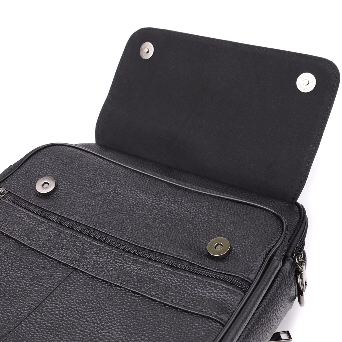 На лицьовій стороні сумки розташована накладна кишенька, яка закривається на блискавку і додатково захищена клапаном на магнітах, а також одна горизонтальна вбудована кишеня на блискавці — зручне рішення для швидкого доступу до необхідних речей.