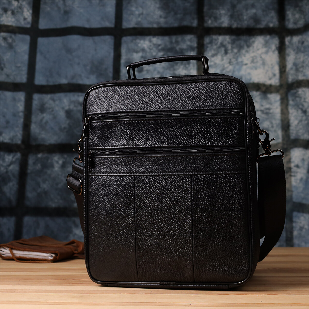 Практична шкіряна сумка виконана з високоякісної натуральної шкіри та поєднує в собі функціональність та стиль. Модель оснащена двома основними відділеннями на блискавці, одне з яких включає таємну кишеню на блискавці на задній стінці для надійного зберігання важливих дрібниць.