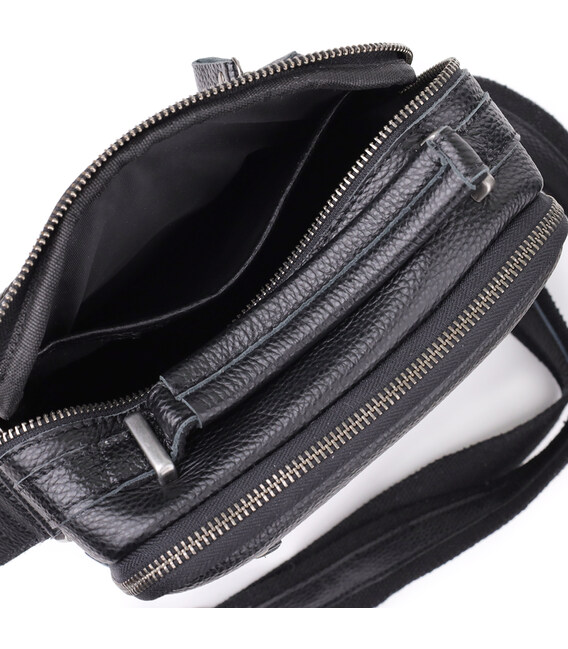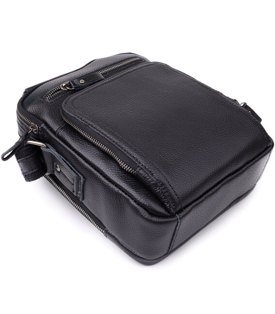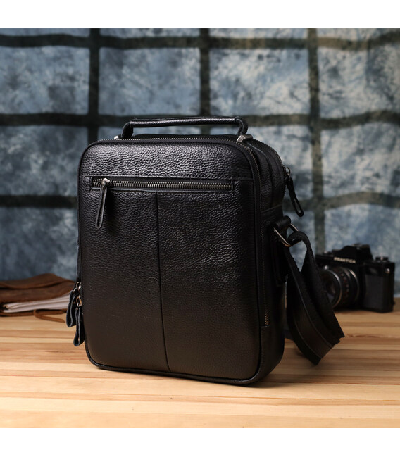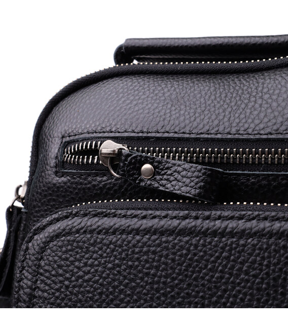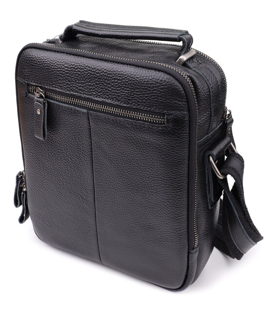 Чорна шкіряна сумка на плече – практичний та стильний аксесуар для повсякденного використання. Модель виконана з натуральної зернистої шкіри флотар, стійка до зношування та зберігає акуратний зовнішній вигляд. Оснащена двома основними відділеннями на блискавці, в одному з яких передбачена потайна кишеня. На лицьовій стороні розміщено накладну кишеню на блискавці та горизонтальну вбудовану кишеню. На тильній стороні — зручна кишеня на блискавці. Сумка доповнена міцною шкіряною ручкою та регульованим незнімним шкіряним ремінцем для носіння на плечі. Фурнітура кольору срібла надає моделі стриману елегантність.