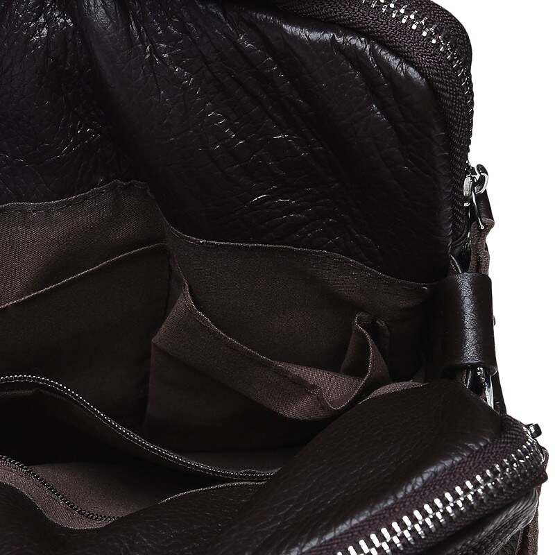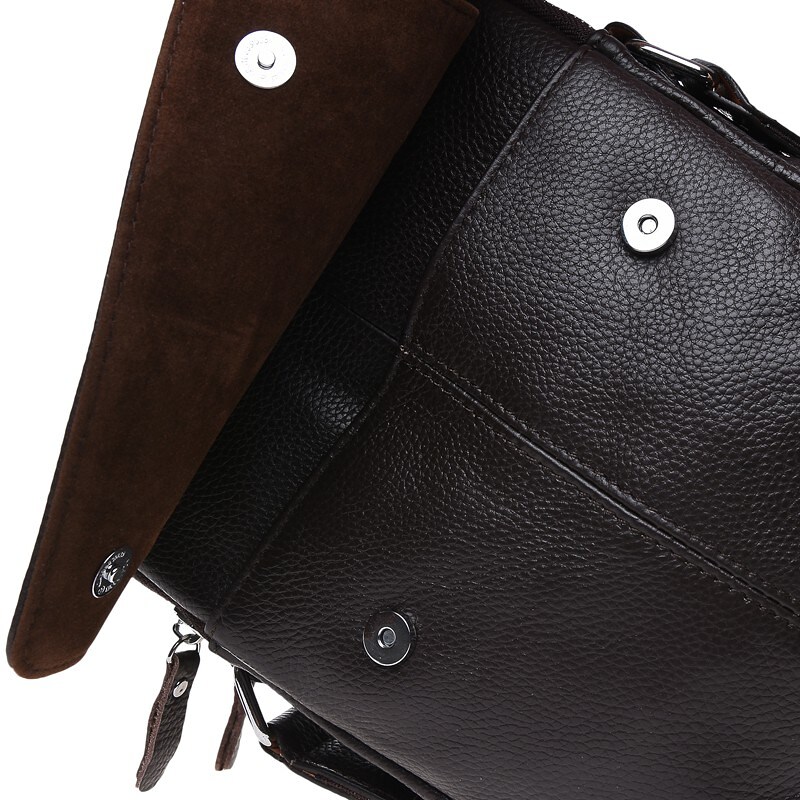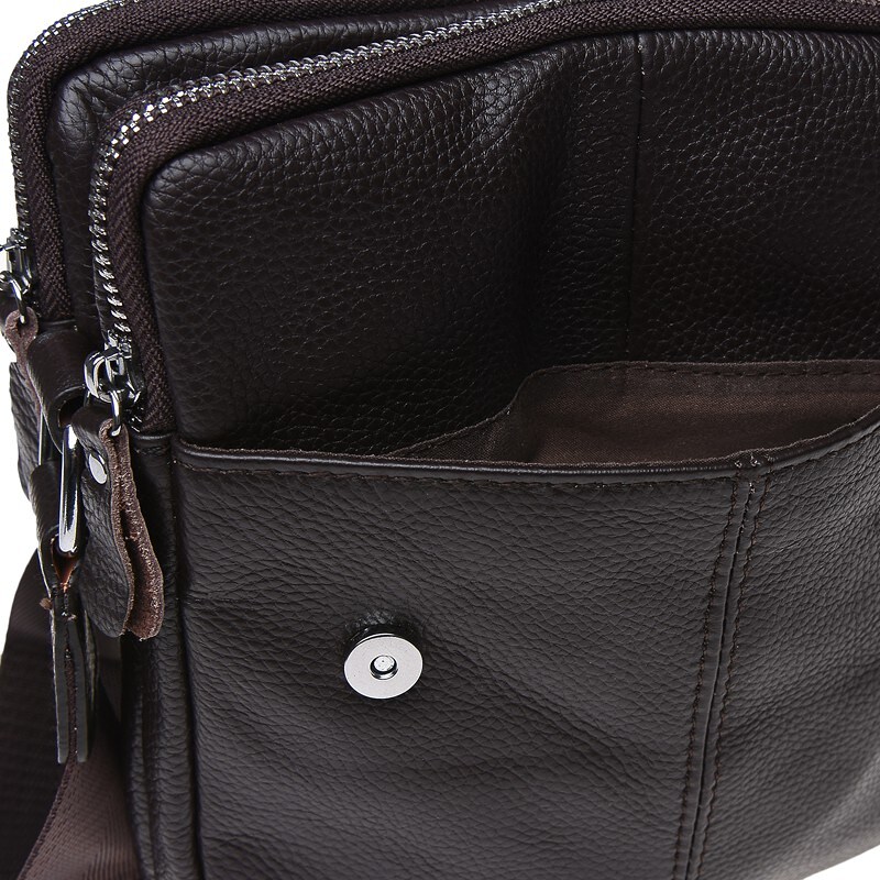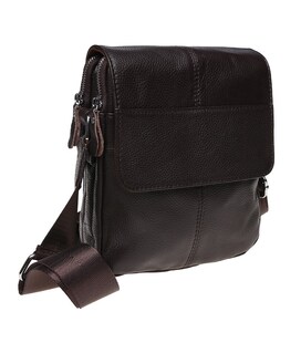 Шкіряна сумка на плече для чоловіків. Закривається на клапан. Має 3 відділи. Два відділи закриваеются на блискавку, між ними відділ, в якому знаходяться 3 кишені. З лицьового боку-накладна кишеня на кнопках. З тильного боку-кишеня на блискавці. Підкладка текстиль. Колір фурнітури-срібло. Плечовий ремінь регулюється по довжині.