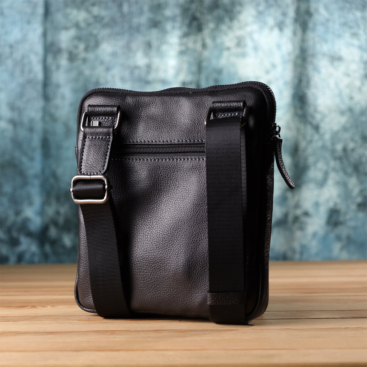 Ця чоловіча вертикальна сумка виготовлена з натуральної зернистої шкіри класичного чорного кольору. Завдяки міцній текстурі та акуратній обробці аксесуар виглядає стильно та універсально, легко поєднуючись із діловим та повсякденним чином.