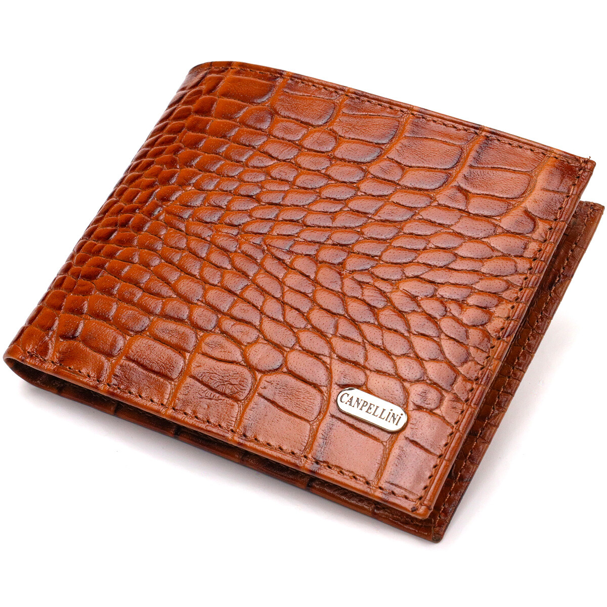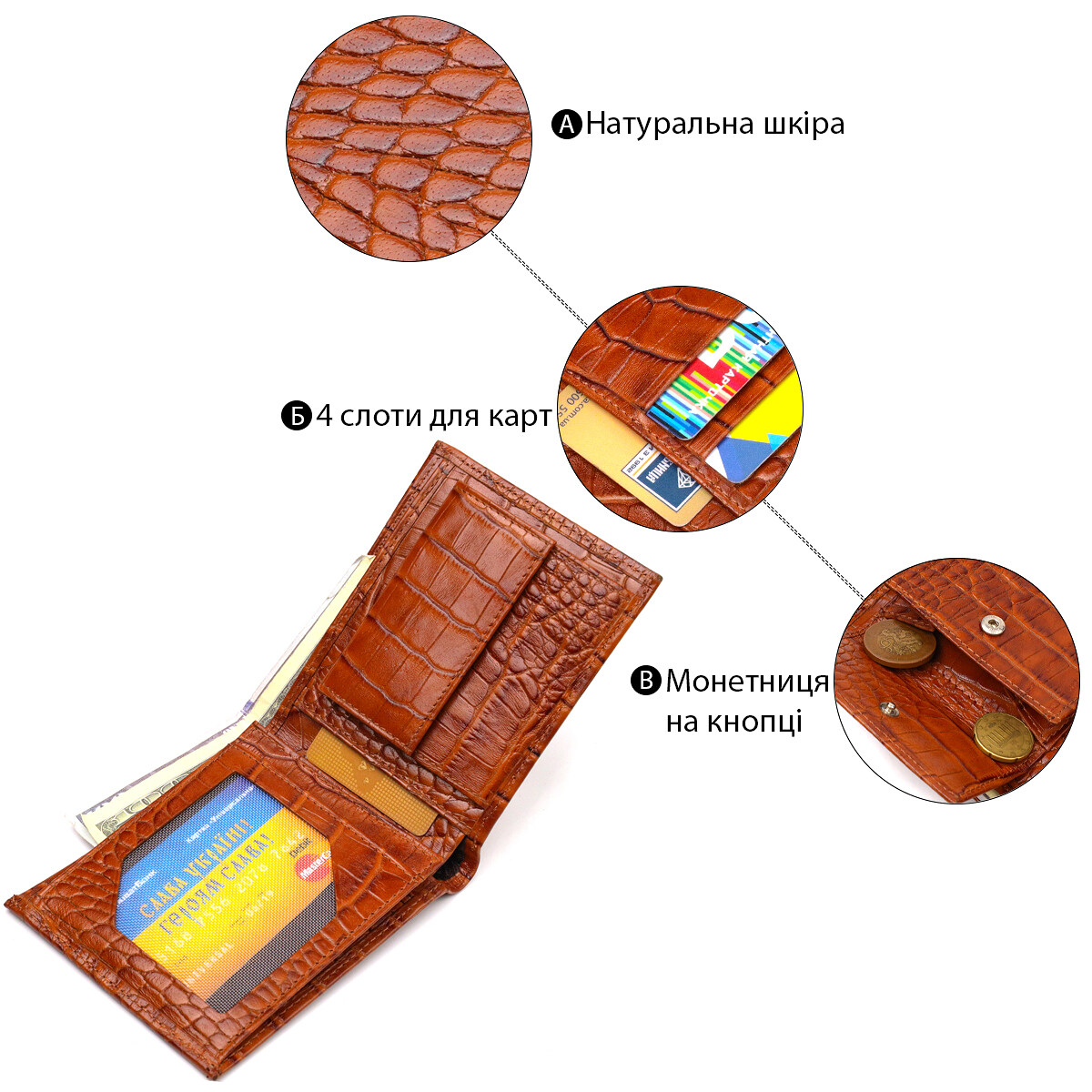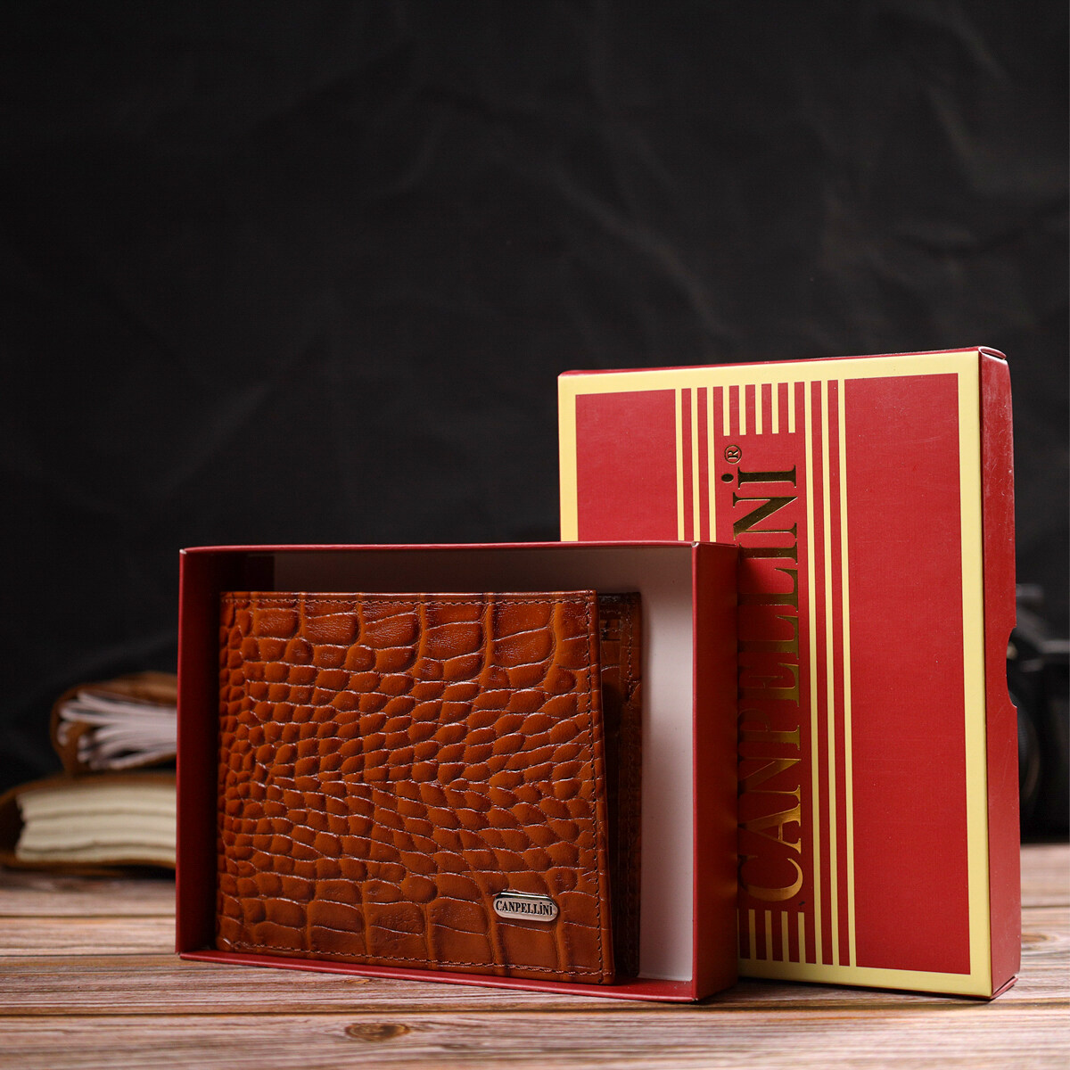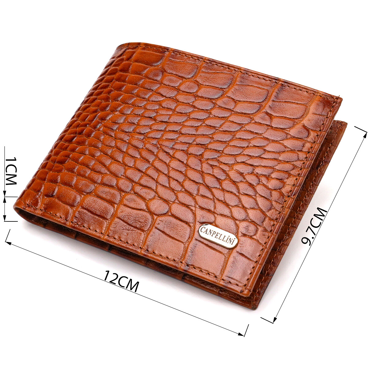 Ультрамодний чоловічий гаманець у красивому коричневому кольорі з натуральної фактурної шкіри з тисненням під крокодила. Аксесуар має одне основне відділення з перегородкою, в яке поміщаються купюри всіх номіналів, чотири кишені для карток, дві кишені під сіточкою для документів, монетницю та три прилеглі кишені. Закривається аксесуар навпіл без застібки. Запакований гаманець картонну коробку. Шкіряний гаманець є чудовим подарунком для рідних та близьких людей.