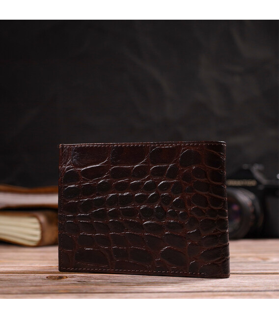 Якісний і приємний на дотик чоловічий гаманець із натуральної шкіри із тисненням під крокодила. Аксесуар має основне відділення для купюр, сім осередків для кредиток, три кишені під сіточкою для перепусток, дві приховані кишені, кишеню на блискавці. На лицьовій стороні, у правому нижньому куті металевий логотип компанії виробника. Якщо ви вибрали товар цієї фірми, можете не сумніватися, що виріб прослужить дуже довго і не втратить свого первісного вигляду.