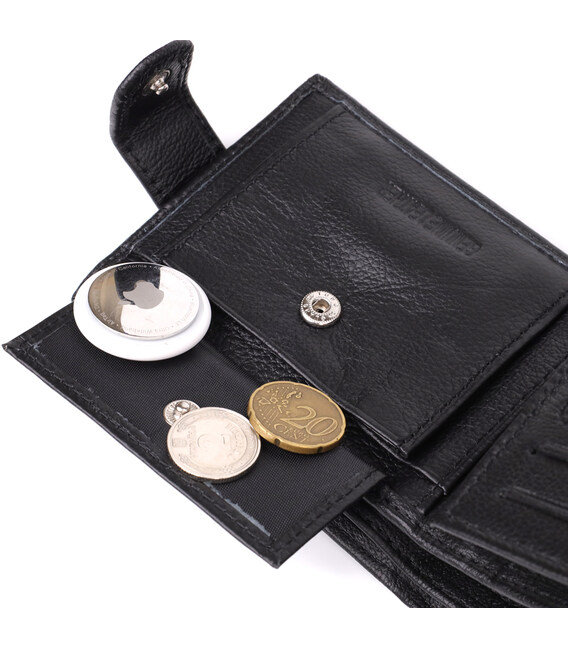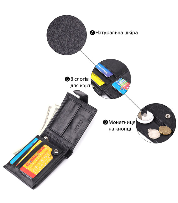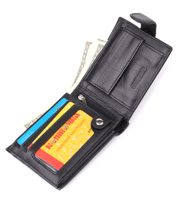 Місткий гаманець для чоловіків, які цінують якість та практичність. Аксесуар з натуральної добротної шкіри, він складається з двох містких відділень для купюр, двох прихованих кишень, трьох кишень під плівкою, восьми осередків для пластикових карток, кишені на блискавці та кишені для монет. У нижньому правому кутку знаходиться акуратний металевий логотип бренду, що підтверджує оригінальність та оригінальність.