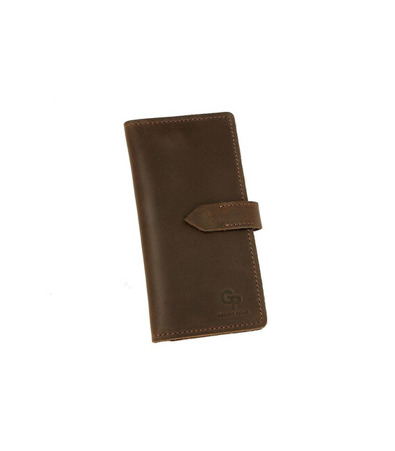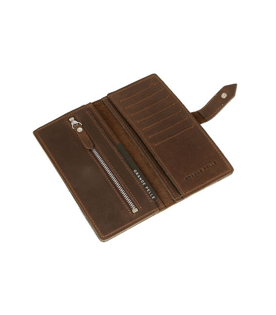 Портмоне чоловіче довге Grande Pelle 523120 у кольорі шоколад з хлястиком на кнопці. 4 слоти під купюри, 7 слотів під карти, монетниця на блискавці на всю довжину.