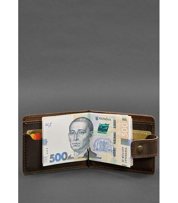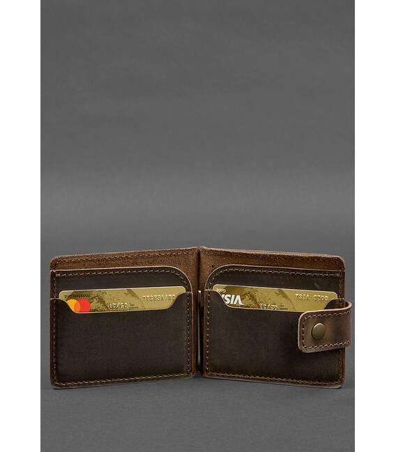 Шкіряне портмоне 13.1 затискач з хлястиком темно-коричневе Crazy Horse ідеально підходить для зберігання ваших коштів. Гаманець має два слоти для карт всередині, які легко вміщують вашу кредитну картку, водійське посвідчення або будь-яку іншу картку, яку ви хочете носити з собою.