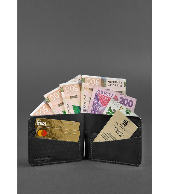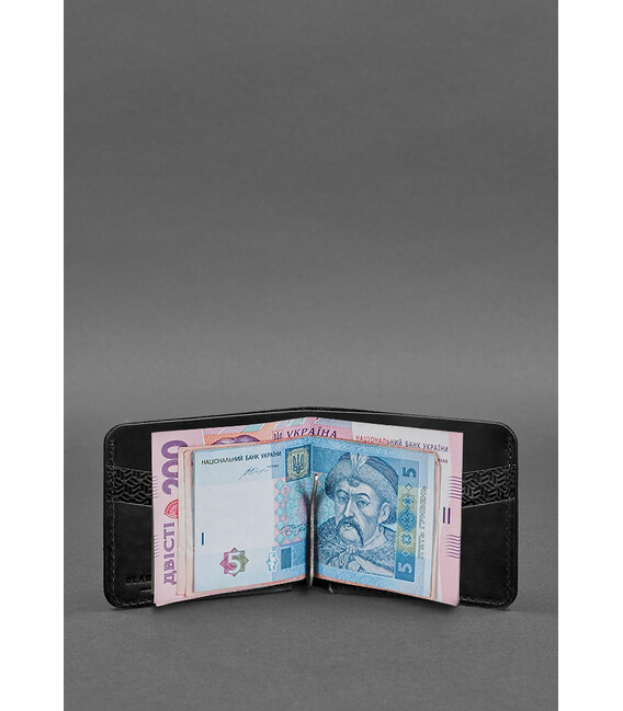 Шкіряне портмоне 4.4 (з затискачем) чорний Crazy Horse карбон — відмінний вибір для тих, хто шукає стильне та практичне рішення для зберігання кредитних карток та готівки. Виготовлене портмоне з високоякісної шкіри Crazy Horse з тисненням у вигляді бджолиних стільників. Воно забезпечує тривалість та елегантний зовнішній вигляд. Усередині гаманця є чотири кишені для кредитних або дебетових карток, які забезпечують безпечне та організоване зберігання. Відділення для банкнот розташоване в центрі гаманця та дозволяє зручно розмістити купюри різних номіналів. Також є зручний затиск для купюр, який допомагає зберегти гроші в безпеці та уникнути їх випадкового випадання. В цілому, цей шкіряний гаманець — ідеальний аксесуар для організації ваших фінансових засобів та привабливий елемент для вашого повсякденного стилю