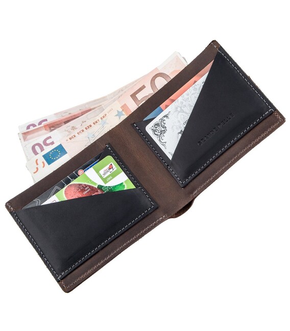 Оригінальне портмоне в комбінації двох кольорів. Слоти для кредиток, всередині портмоне, виготовлені з натуральної шкіри чорного кольору. Останнім часом аксесуари в комбінації різних типів шкіри або кольорів користуються особливою популярністю у клієнтів. Виріб дуже солідно і оригінально виглядає. Аксесуар стане прекрасним подарунком для близької людини. По краях модель прошита рівною рядком. На лицьовій стороні і всередині виробу є логотип бренду. Варто звернути увагу, що портмоне не закривається. У комплекті до виробу йде фірмова картонна коробка.
